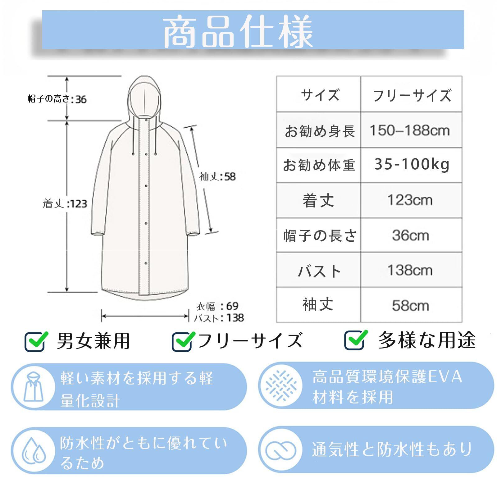 【製品仕様】マッキントッシュの長さは約123cm、フードの高さは36cm、袖丈は58cm、胸囲は138cm、幅は69cmで、オススメ身長150cm-185cm。 雨の日に完璧なシェルターソリューションを提供します。