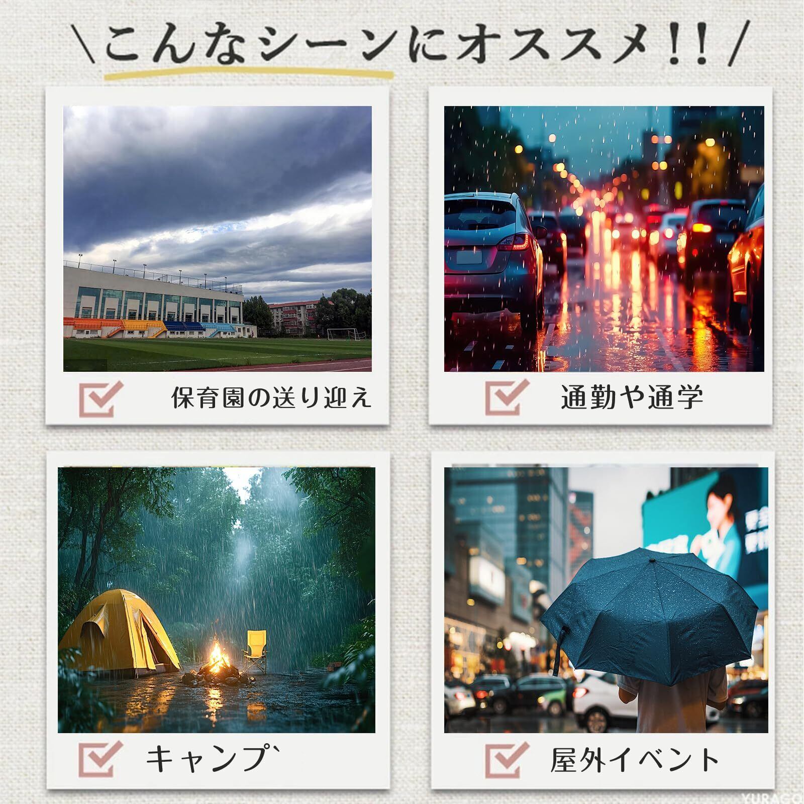 「軽量設計で、必要ない時にはコンパクトに折りたたむことが可能です。付属の収納袋に入れておけば、バックパックやトランクの中に簡単に収納でき、突然の雨にも備えができます。」