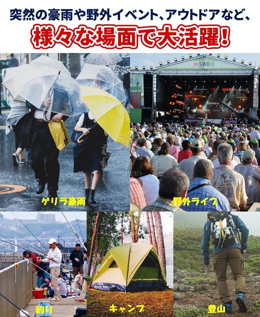 「軽量設計で、必要ないときにはコンパクトに折りたたむことができます。持ち運びに便利な収納袋付きで、バックや車の中にさっと収納しておけます。アウトドア活動や突然の雨にもすぐに対応できるアイテムです。」