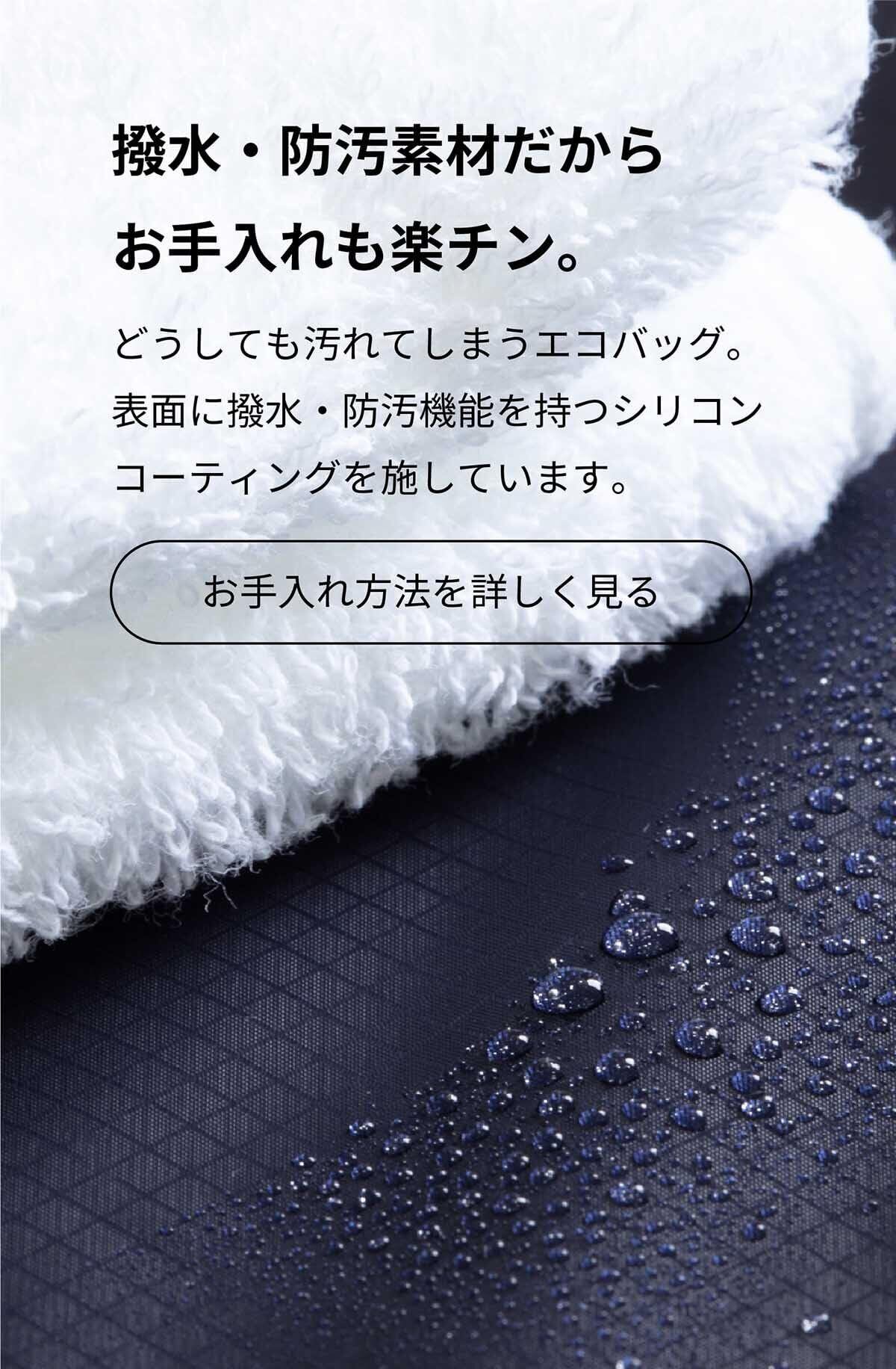 撥水・防汚素材だから、お手入れも楽チン どうしても汚れてしまうエコバッグ。 コーデュラ素材だから、さっと一拭きでいつでも清潔に。