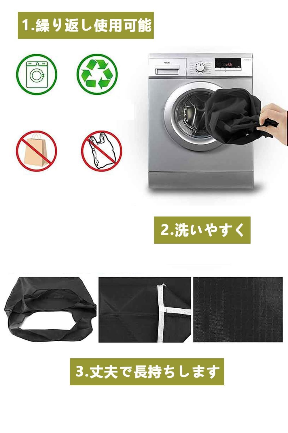 「高品質なポリエステル素材を採用しており、繰り返しの使用にも耐久性があります。さらに、洗濯機で手軽に洗えるため、いつでも清潔に保つことができます。環境に優しい選択として、長く愛用できるエコバッグです。」