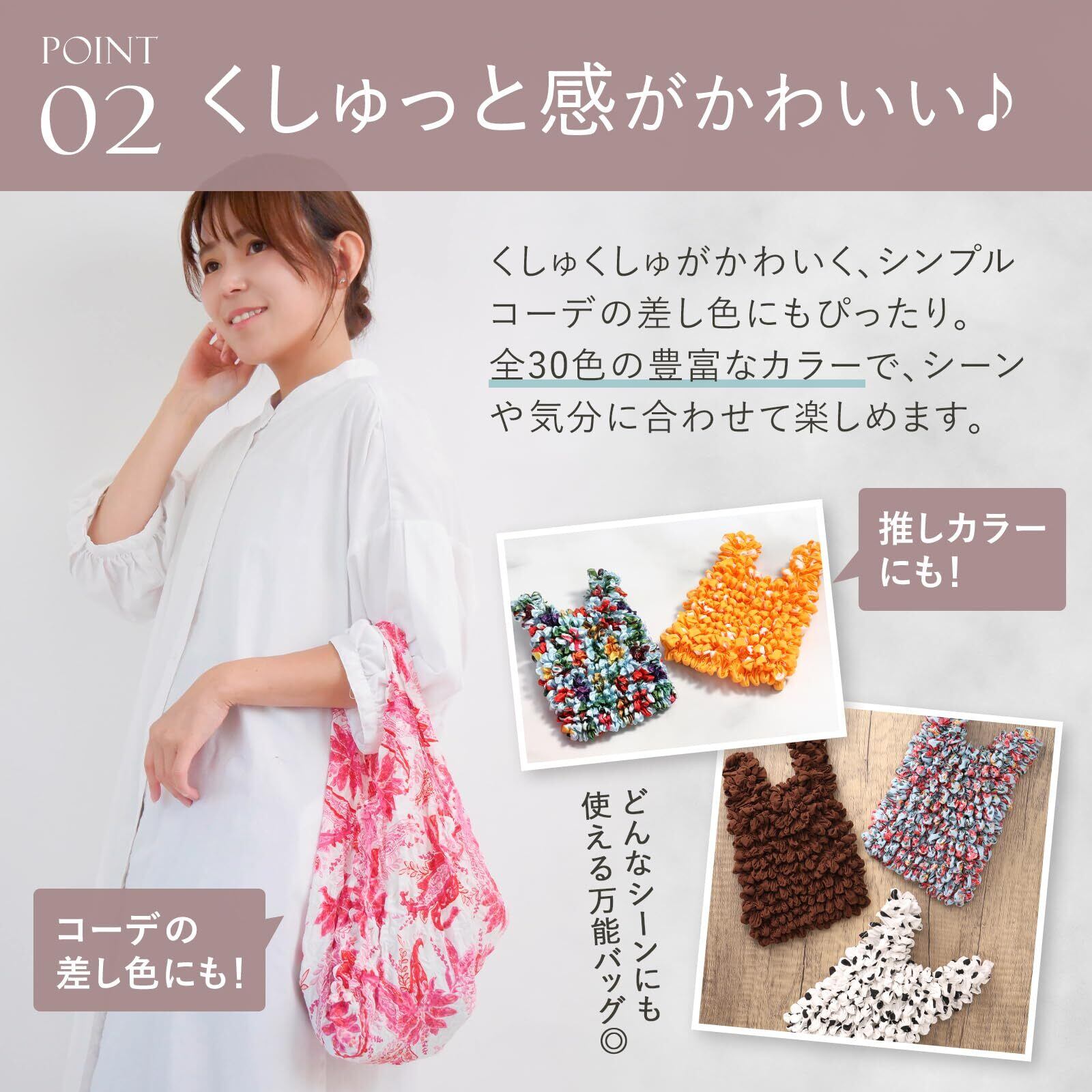 「『[Daction] くしゅくしゅエコバッグ』は、可愛らしいデザインと機能性を兼ね備えた小さめエコバッグです。シュリンク素材で、絞りや伸縮が楽しめるユニークな形状が特長で、日常のお買い物やお出かけにぴったりのアイテムです!」