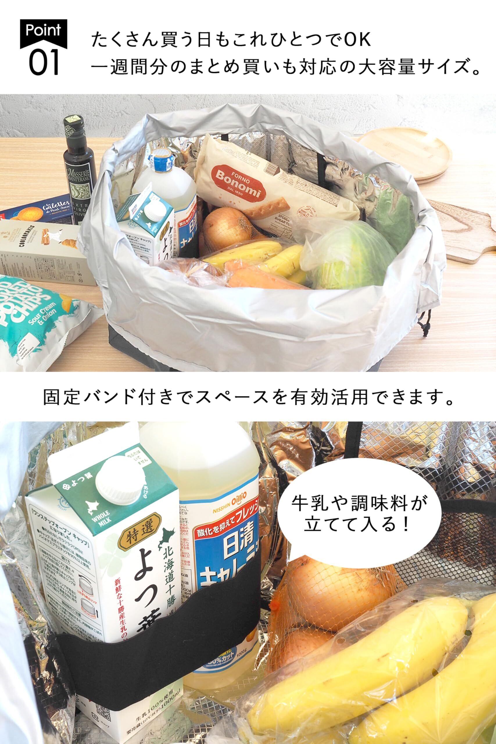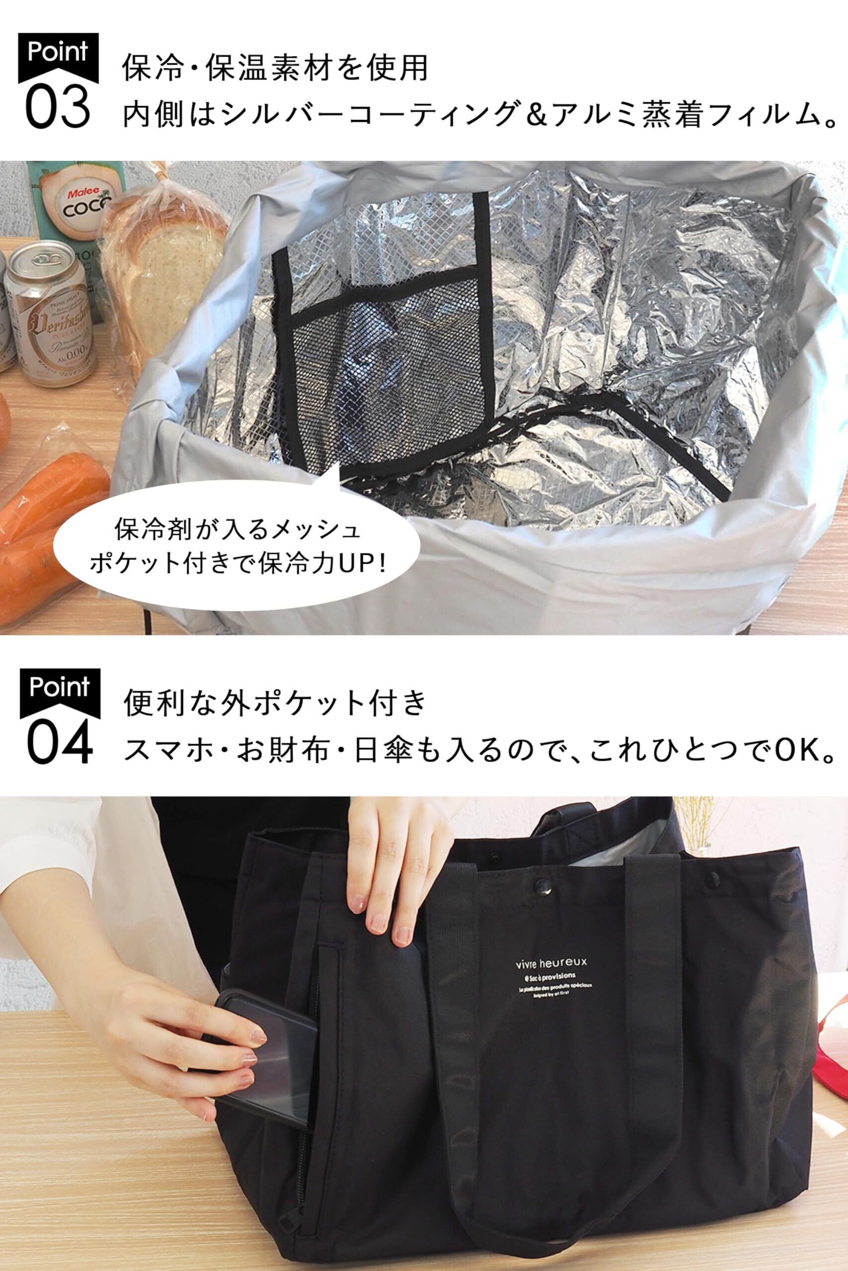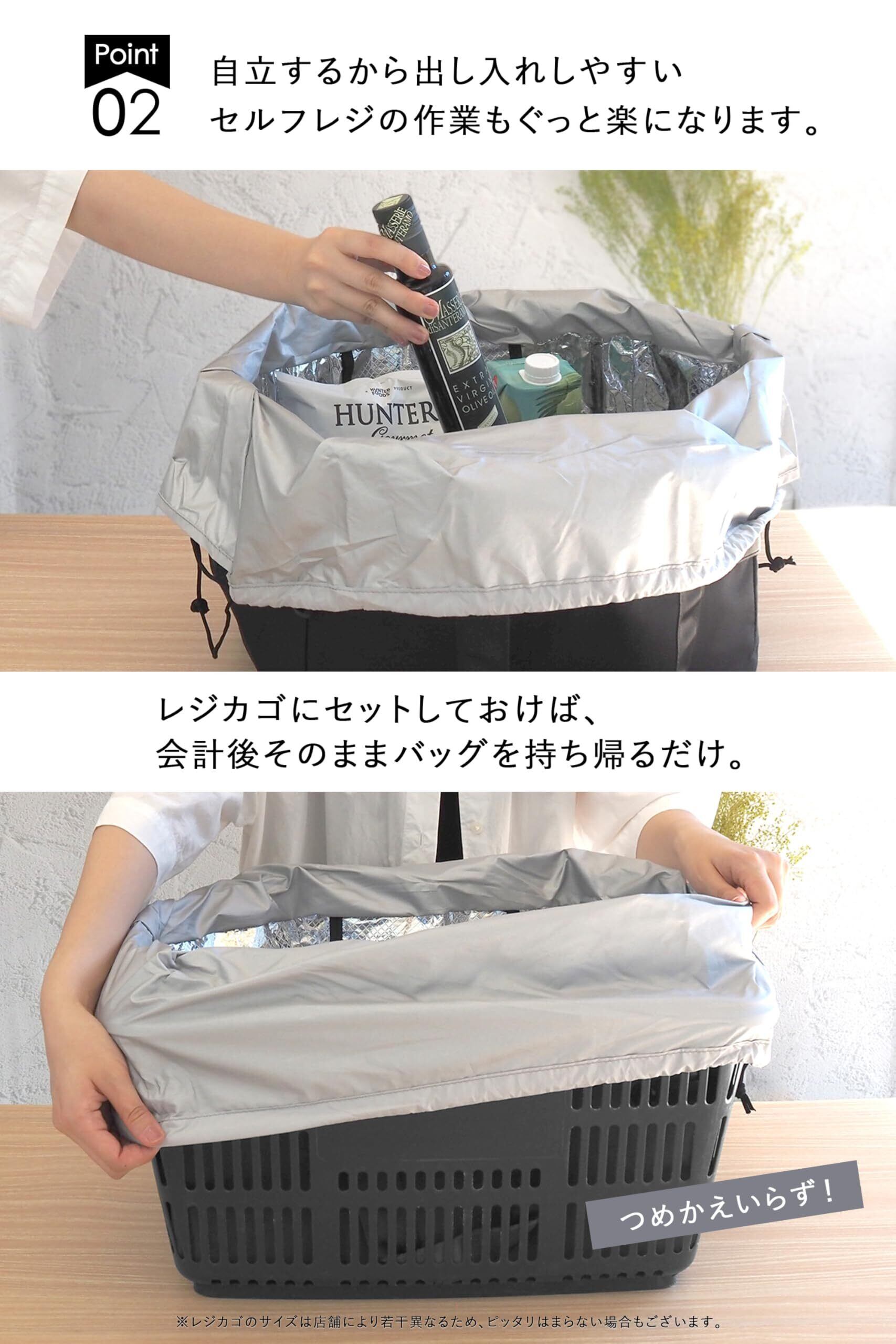 「特製の保冷素材を使用しており、冷蔵品や冷凍品も安心して持ち運べます。買い物から帰るまでの間、食品をしっかりと保冷し、美味しさを逃しません。」