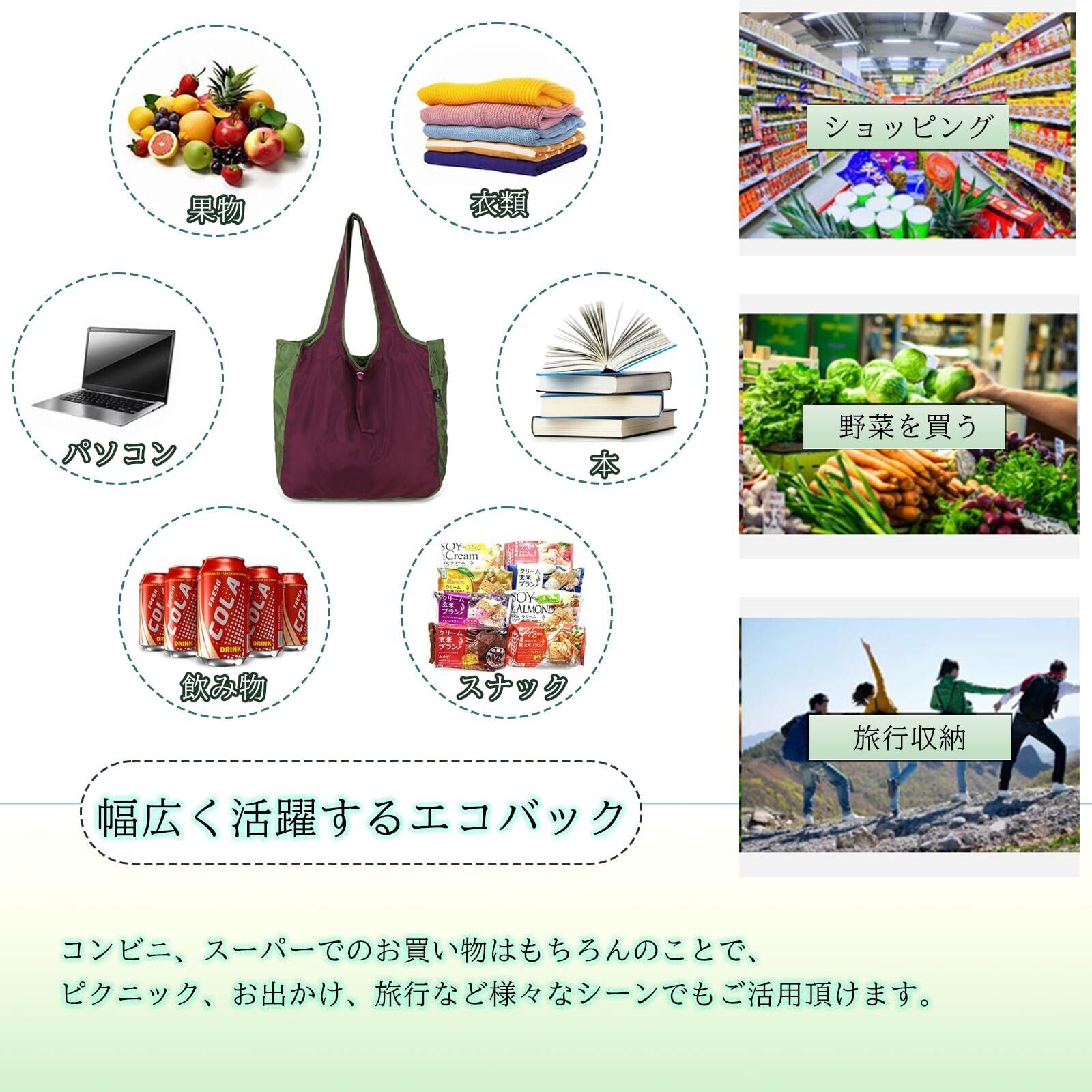 「このエコバッグは大きめのサイズで、日常のお買い物や旅行のサブバッグとしても大変重宝します。必要なものをすべて収納できるので、外出先でも心配無用です!」