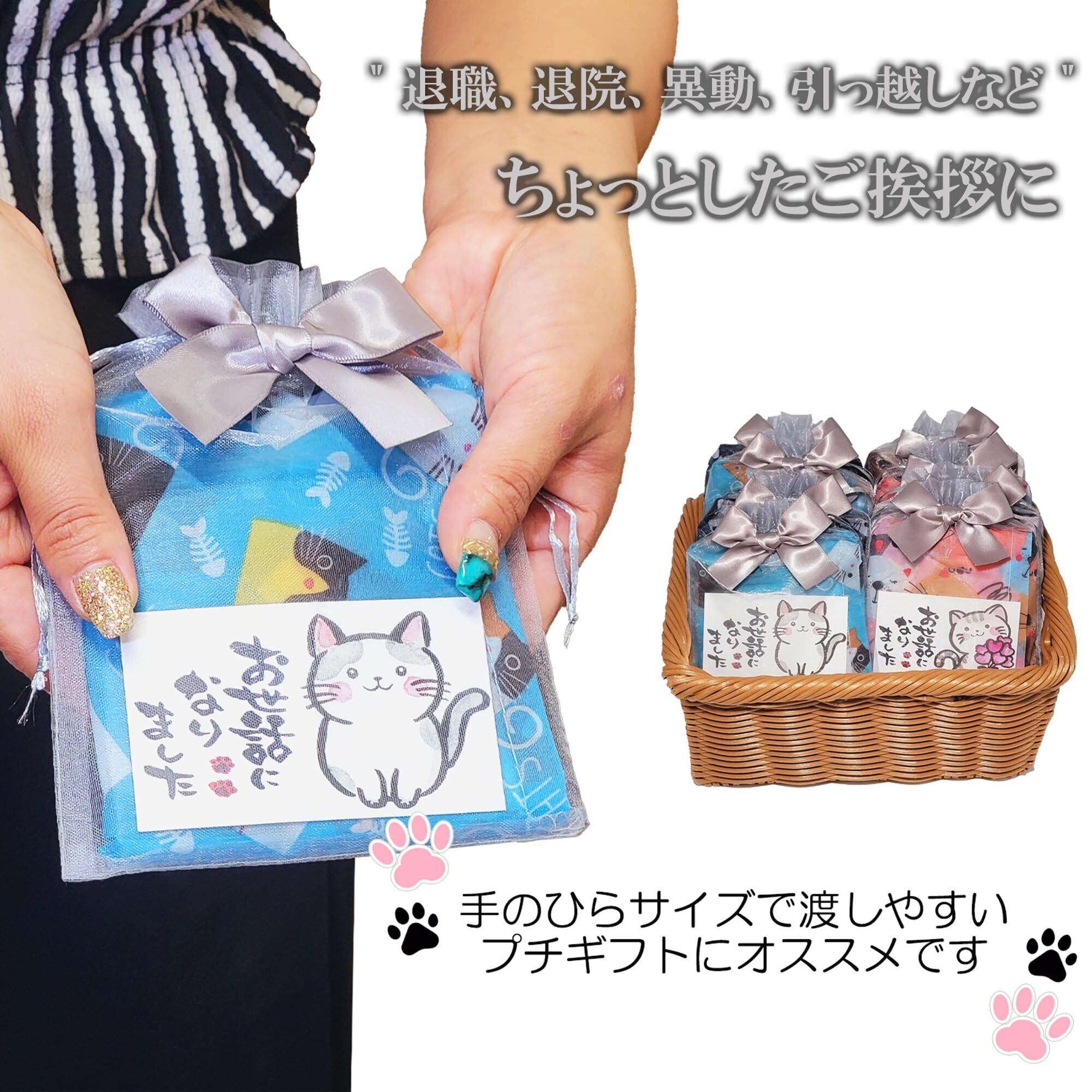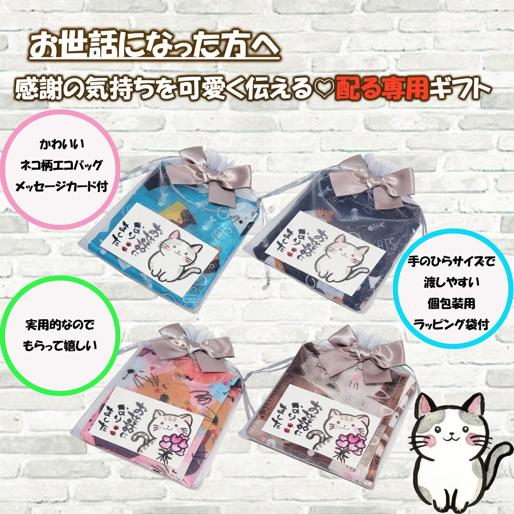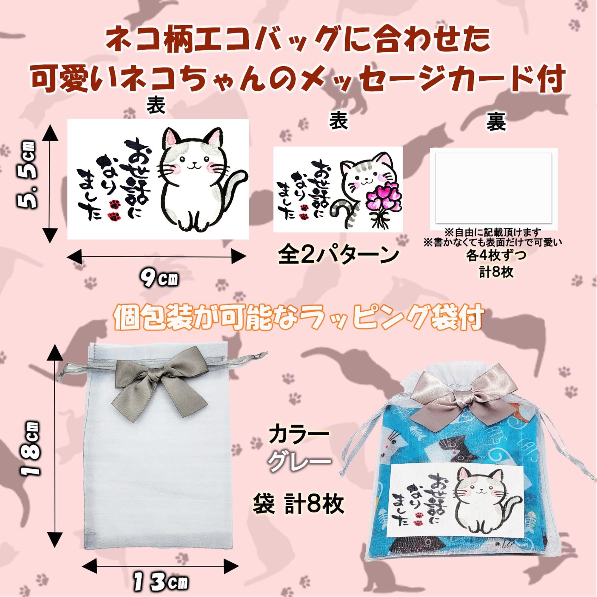 【内容量】 ・エコバッグ 4種×2 計8個 (広げ時サイズ46㎝×60cm×マチ8cm) (収納時サイズ11㎝×12cm) 重量28g 素材 ポリエステル ・ラッピング袋 1色×8 計8枚 サイズ13㎝×18cm ・メッセージカード 2種×4 計8枚 サイズ9㎝×5.5cm 【梱包サイズ】 25.5cm×23cm×3cm 【総重量】 全体重さ250g 【ちょっとしたご挨拶用のプチギフトとして】退職、退院、異動、引っ越しなどのプチギフトとしてオススメです。手のひらサイズで渡しやすく「ありがとう」、「可愛い」と、自然に会話が生まれるような商品づくりをコンセプトにしているプチギフトです。 【かわいくて実用的】ネコ柄のエコバッグ&メッセージカードは感謝の気持ちを可愛く伝えることが出来ます。尚且つ実用的なので贈る側もお手軽に、受け取る側も、もらって嬉しい、理想的なプチギフトです。 【高性能】撥水加工で洗濯OK、丈夫でシワになりにくい「ポリエステル」生地使用。最大荷重12kg。エコバッグ自体に収納袋付で収納袋が紛失する恐れはございません。持ち運びに便利なコンパクトサイズ。さまざまなシチュエーションで活用出来ます。 【特別感】エコバッグ4種、ラッピング袋1色、メッセージカード2種、バリエーション豊富でさまざまな組み合わせが可能です。 お渡しする1人ひとりに特別感を演出可能です。