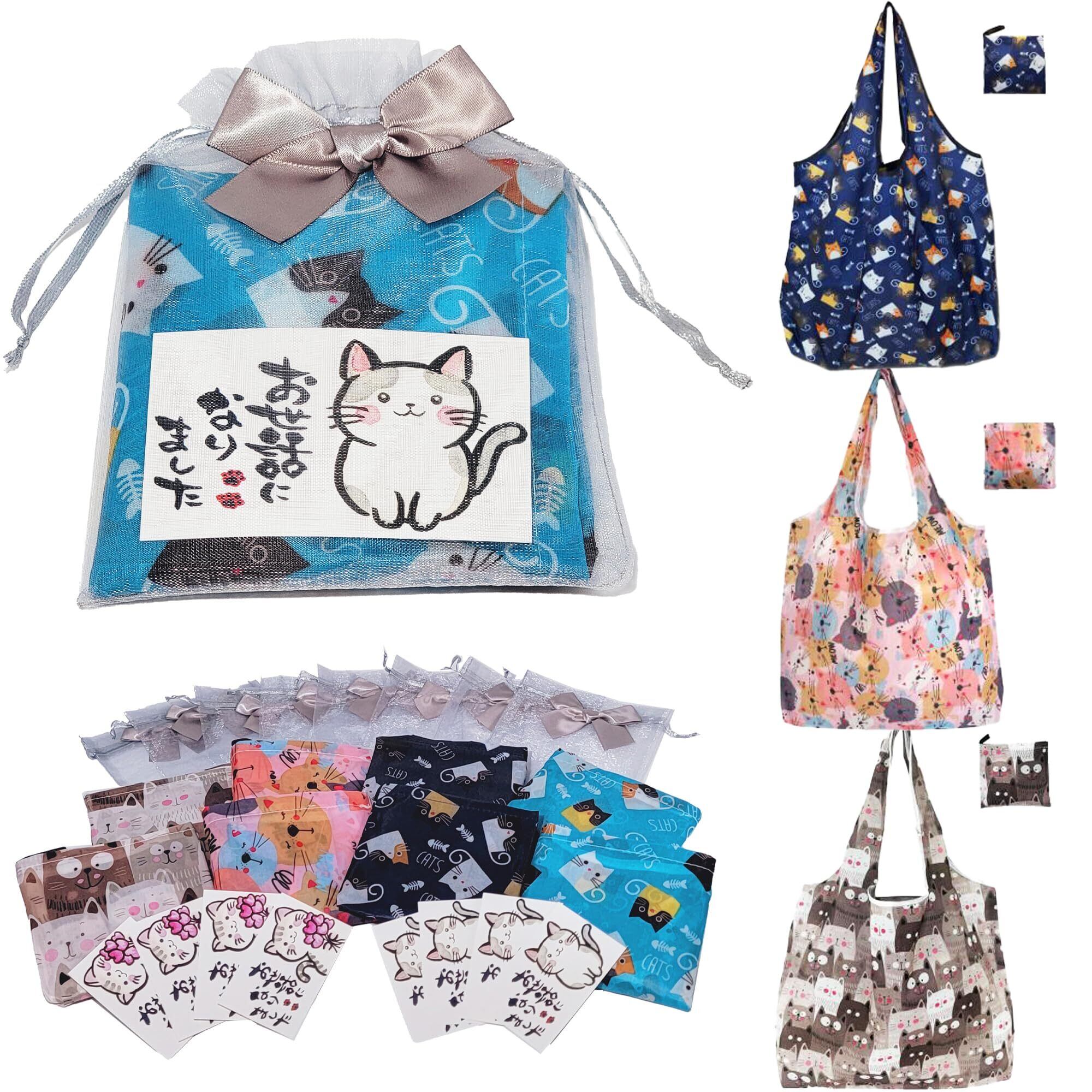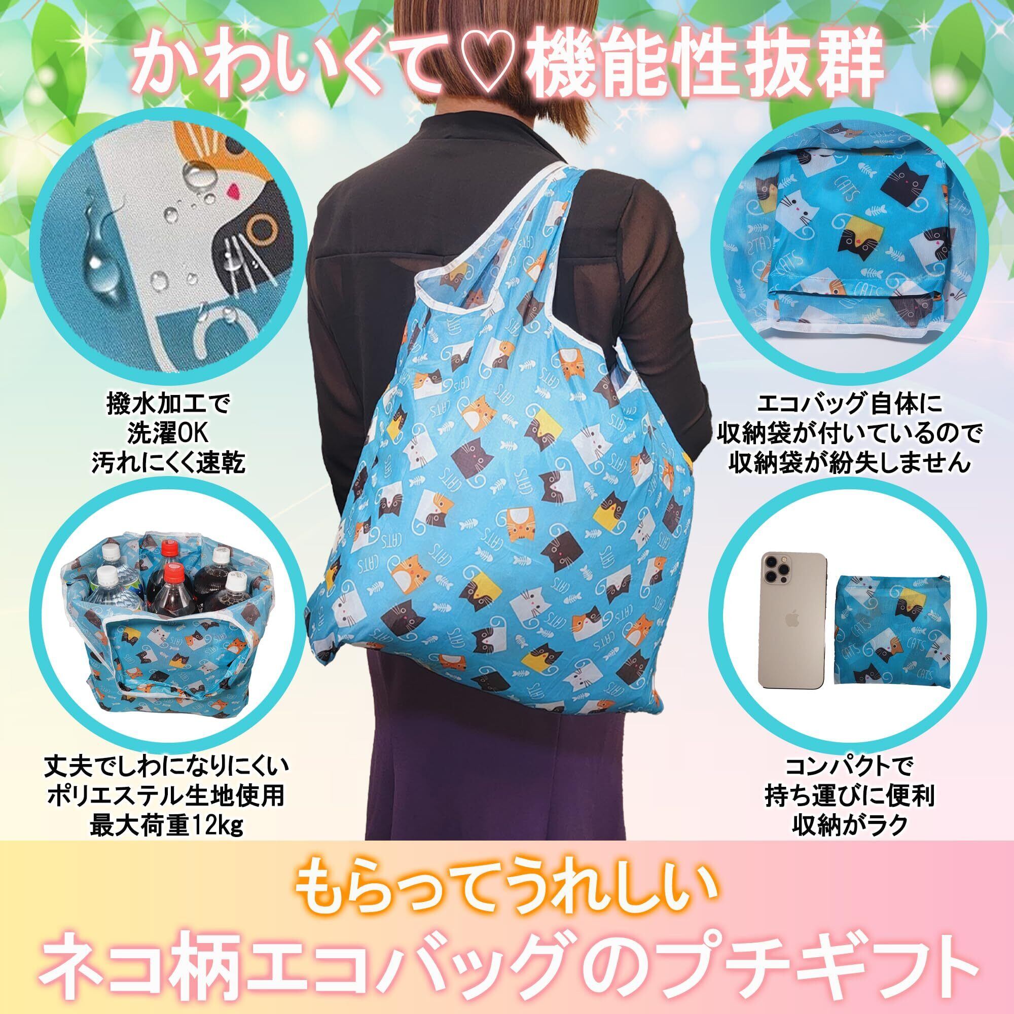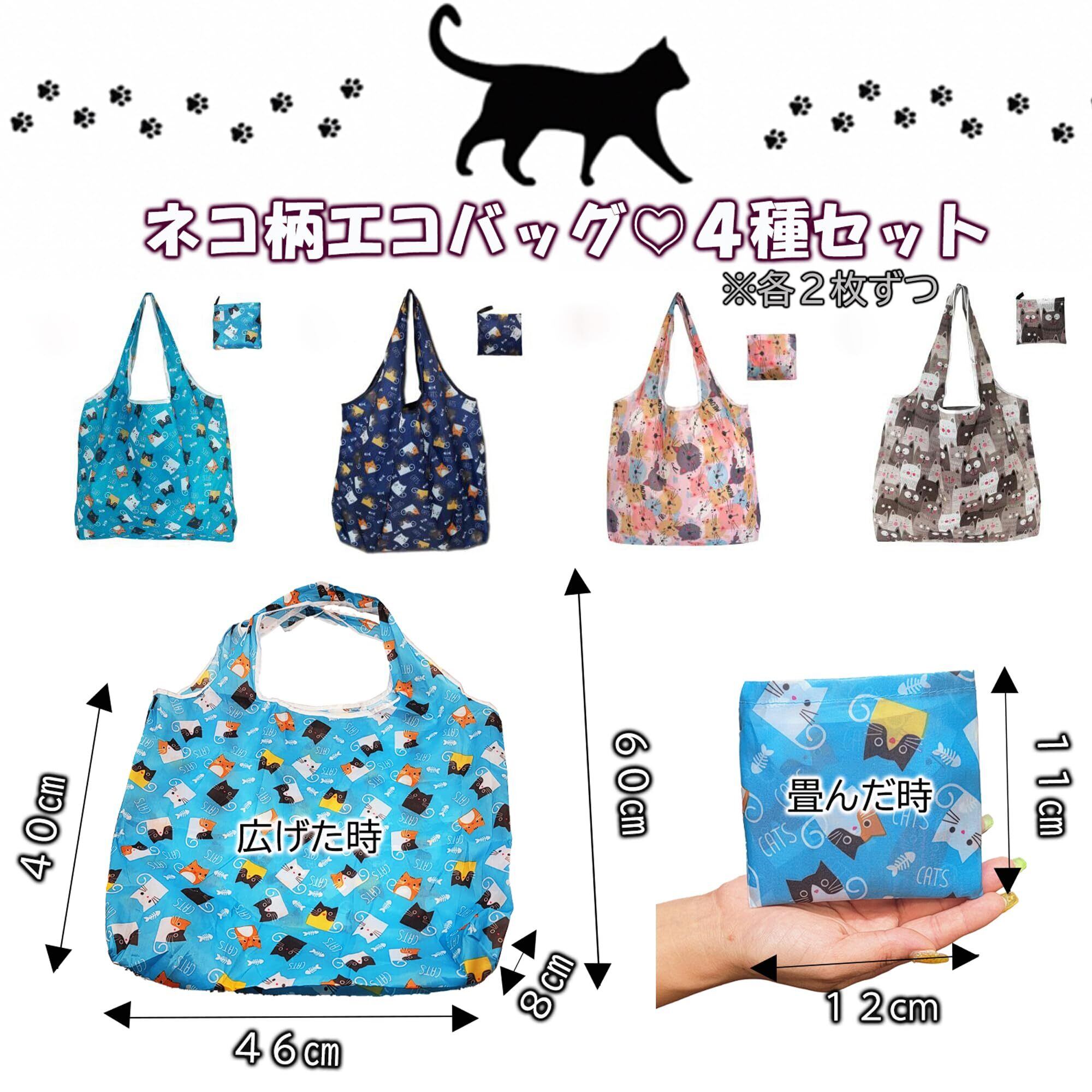 【内容量】 ・エコバッグ 4種×2 計8個 (広げ時サイズ46㎝×60cm×マチ8cm) (収納時サイズ11㎝×12cm) 重量28g 素材 ポリエステル ・ラッピング袋 1色×8 計8枚 サイズ13㎝×18cm ・メッセージカード 2種×4 計8枚 サイズ9㎝×5.5cm 【梱包サイズ】 25.5cm×23cm×3cm 【総重量】 全体重さ250g 【ちょっとしたご挨拶用のプチギフトとして】退職、退院、異動、引っ越しなどのプチギフトとしてオススメです。手のひらサイズで渡しやすく「ありがとう」、「可愛い」と、自然に会話が生まれるような商品づくりをコンセプトにしているプチギフトです。 【かわいくて実用的】ネコ柄のエコバッグ&メッセージカードは感謝の気持ちを可愛く伝えることが出来ます。尚且つ実用的なので贈る側もお手軽に、受け取る側も、もらって嬉しい、理想的なプチギフトです。 【高性能】撥水加工で洗濯OK、丈夫でシワになりにくい「ポリエステル」生地使用。最大荷重12kg。エコバッグ自体に収納袋付で収納袋が紛失する恐れはございません。持ち運びに便利なコンパクトサイズ。さまざまなシチュエーションで活用出来ます。 【特別感】エコバッグ4種、ラッピング袋1色、メッセージカード2種、バリエーション豊富でさまざまな組み合わせが可能です。 お渡しする1人ひとりに特別感を演出可能です。