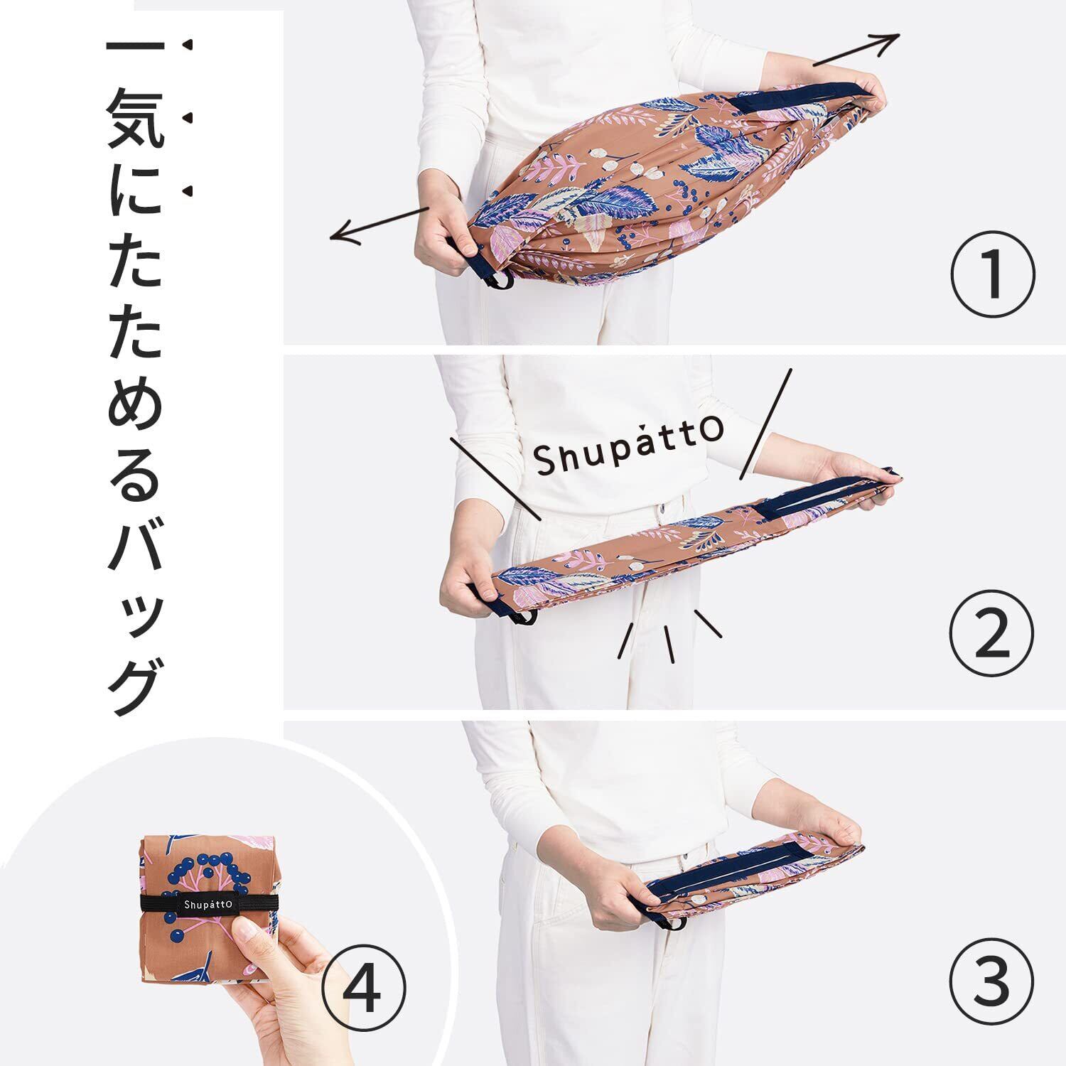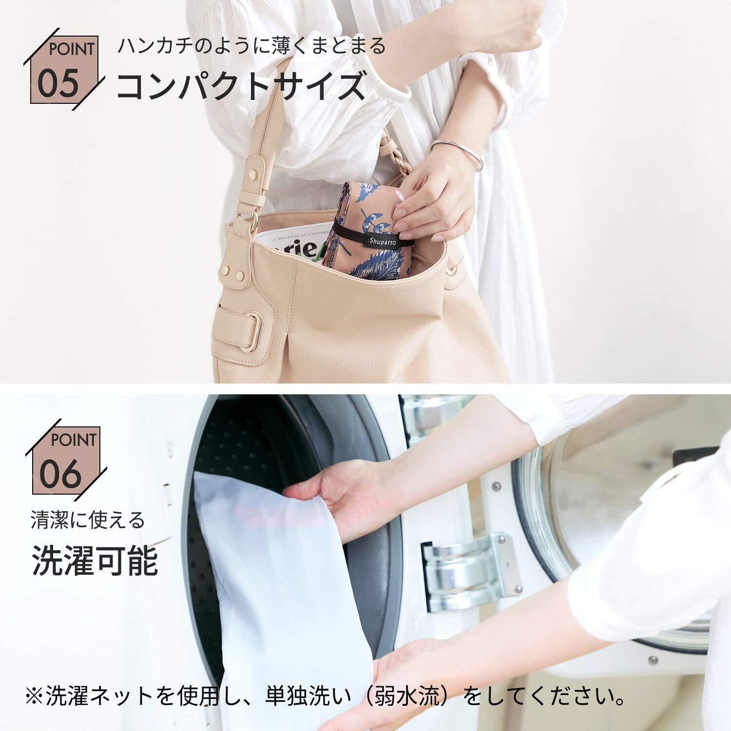 「このバッグは軽量設計で、使用しない時は簡単に折り畳むことができます。バッグ内でもかさばらず、いつでもサッと取り出せるので、日常使いに最適です。」