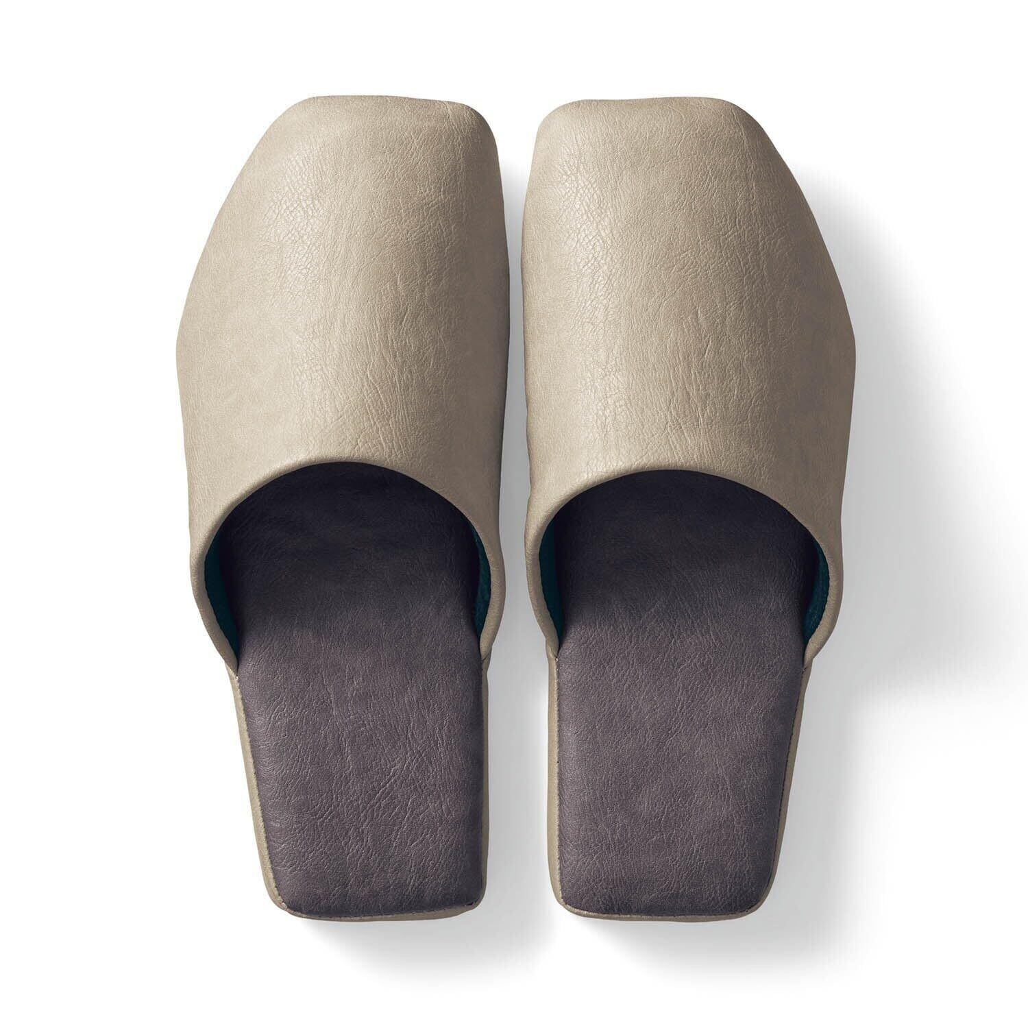 きれいに揃えられる、内側が直線のスリッパ ●トイレでもスリッパを揃える習慣を ●家族にも揃えてほしい人にオススメ ●内側のラインがまっすぐな直線の、ちょっとユニークな形状で、かかとからぴしっと揃えられます ●素材は汚れや水分に強いフェイクレザー ●布物と違ってさっと拭けるのがうれしいポイント ●裏面は発泡PVCの滑りにくい素材を使用