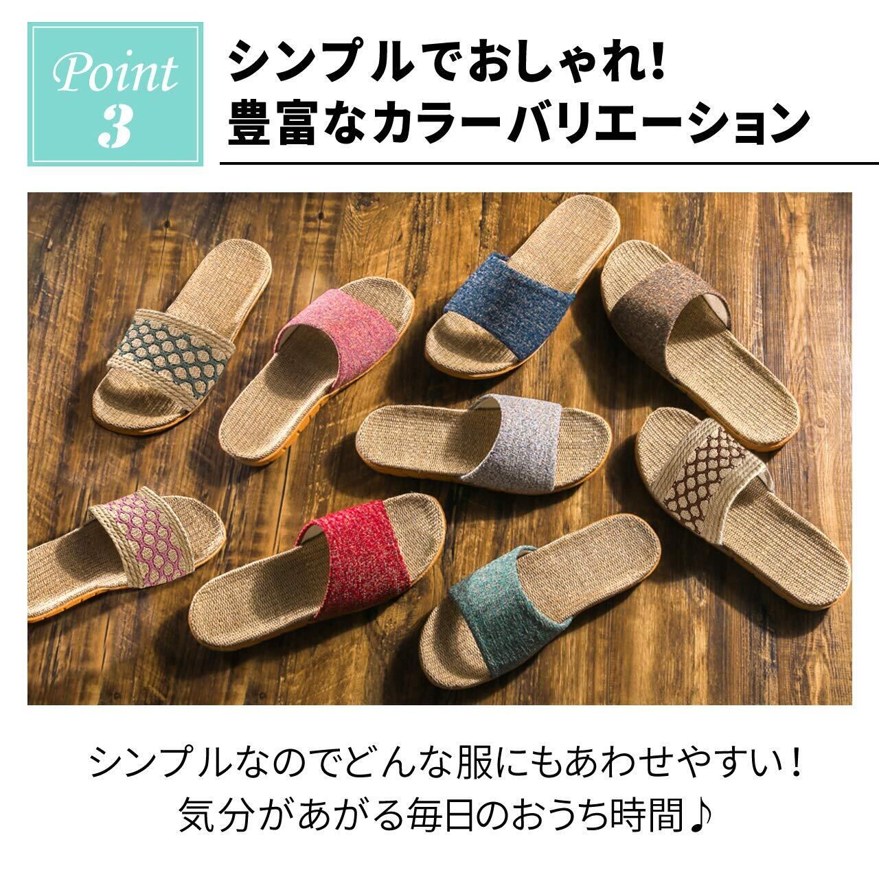「麻の特性を活かしたこのルームシューズは、足をしっかり包み込みつつも、通気性抜群。長時間の使用でも蒸れや不快感がなく、いつでも快適な履き心地を提供します。自宅でのくつろぎにもぴったりです!」
