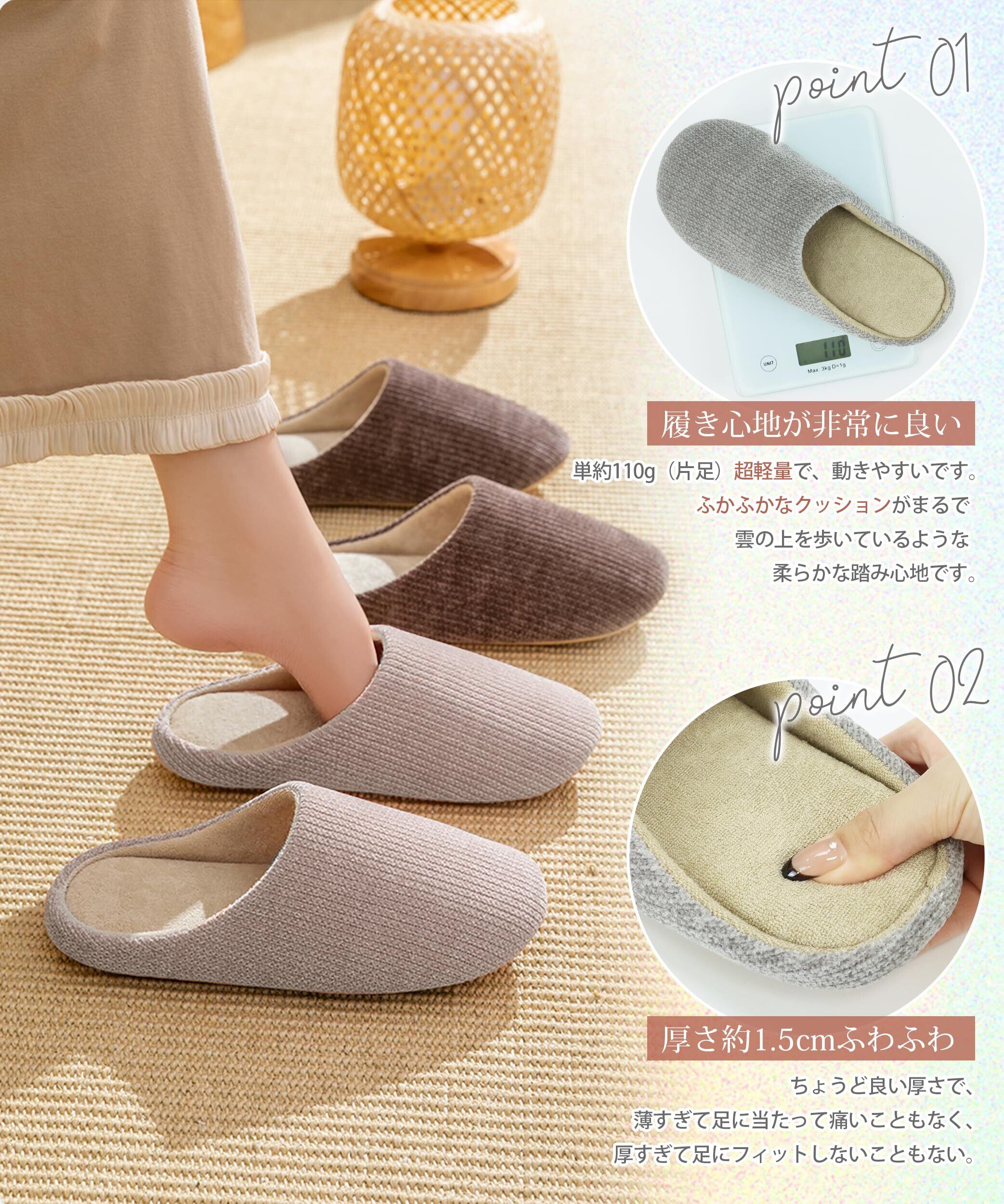 【疲れ大解消!柔らかいソール】一日苦労して家に帰ってきたら履いた瞬間に疲れを解放する魔力スリッパです!しっかりとした厚みのルームシューズのインナーソールはふかふかなクッションが足を優しく包み込めて、まるで雲の上を歩いているような柔らかな踏み心地です。ルームシューズは約110g(片足)超軽量で、動きやすいため、家の中での移動や家事中にもストレスなく使えます。ふわモコのルームシューズで足に優しく、自宅での快適な時間を満喫できます。※真空圧縮袋で丁寧に梱包しており、開封直後に圧縮によるシワや跡が見られる場合がありますが、4〜5日ほどご使用いただくうちに自然に元の状態に戻りますので、あらかじめご了承ください。