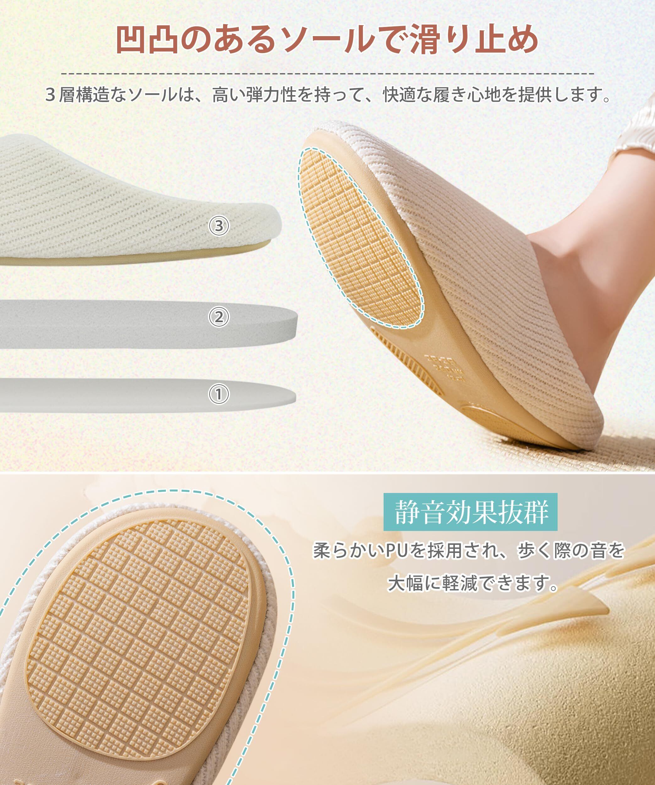【1秒立定滑り止め付き・静音効果抜群】「歩く時、バタバタと足音がうるさいな…」特に静音靴底を開発したルームシューズが登場!スリッパの靴底には、スクラブPUを採用され、歩く際の音を大幅に軽減する超静音仕様で、集合住宅や夜間の使用でも気にせず自由に過ごせます。ルームシューズ靴底は柔らかく弾力性があり、高品質素材を採用しており、地面を傷つけることはありません。また、凹凸のあるソールなので、フローリングなどの滑りやすい床でも安心して使用可能で、滑りやすさを解消するルームシューズです。