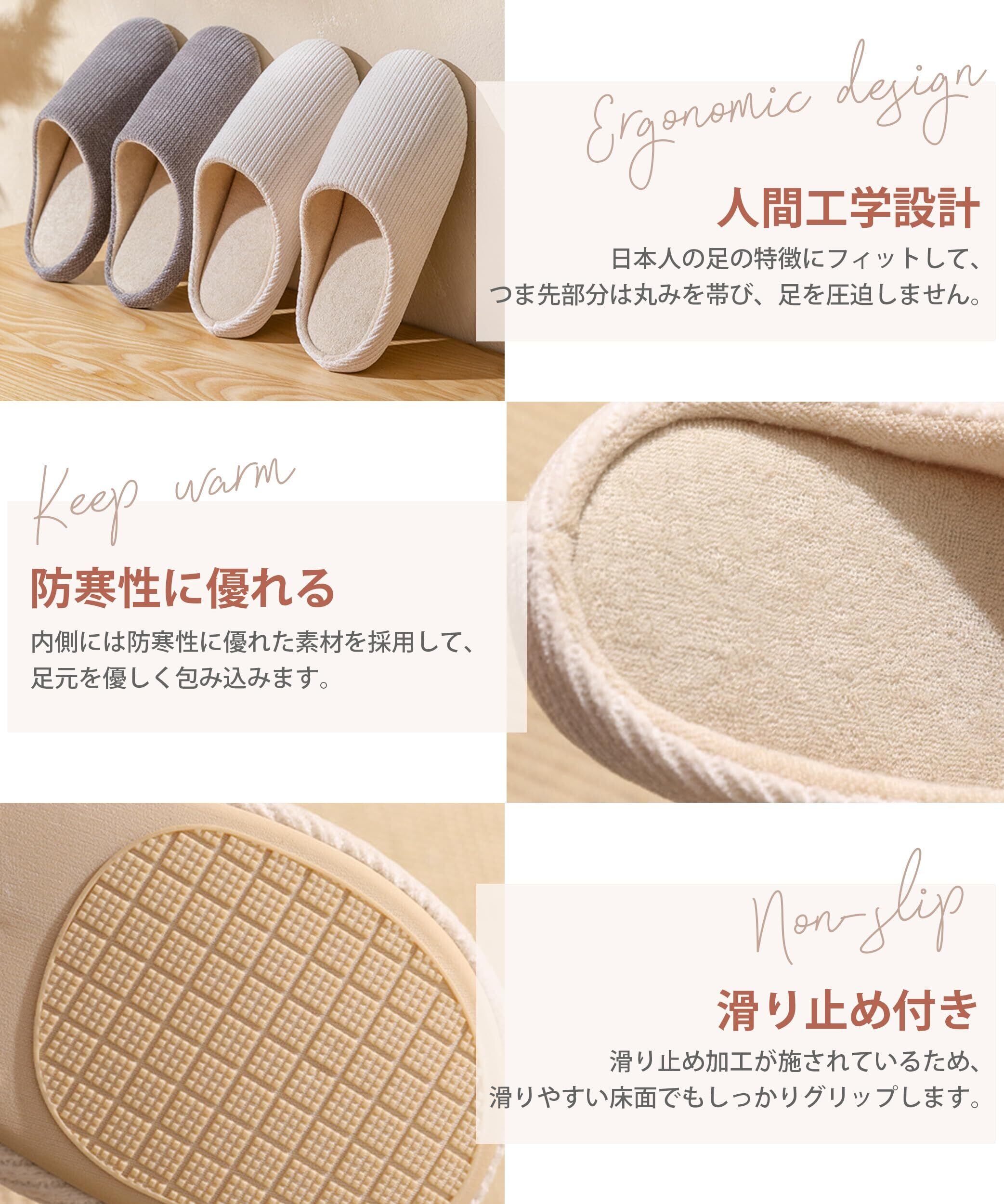 「1秒立定滑り止め機能を搭載したこのルームシューズは、安心して歩ける設計。濡れた床やフローリングでも滑りにくく、家の中を自由に移動できます!」