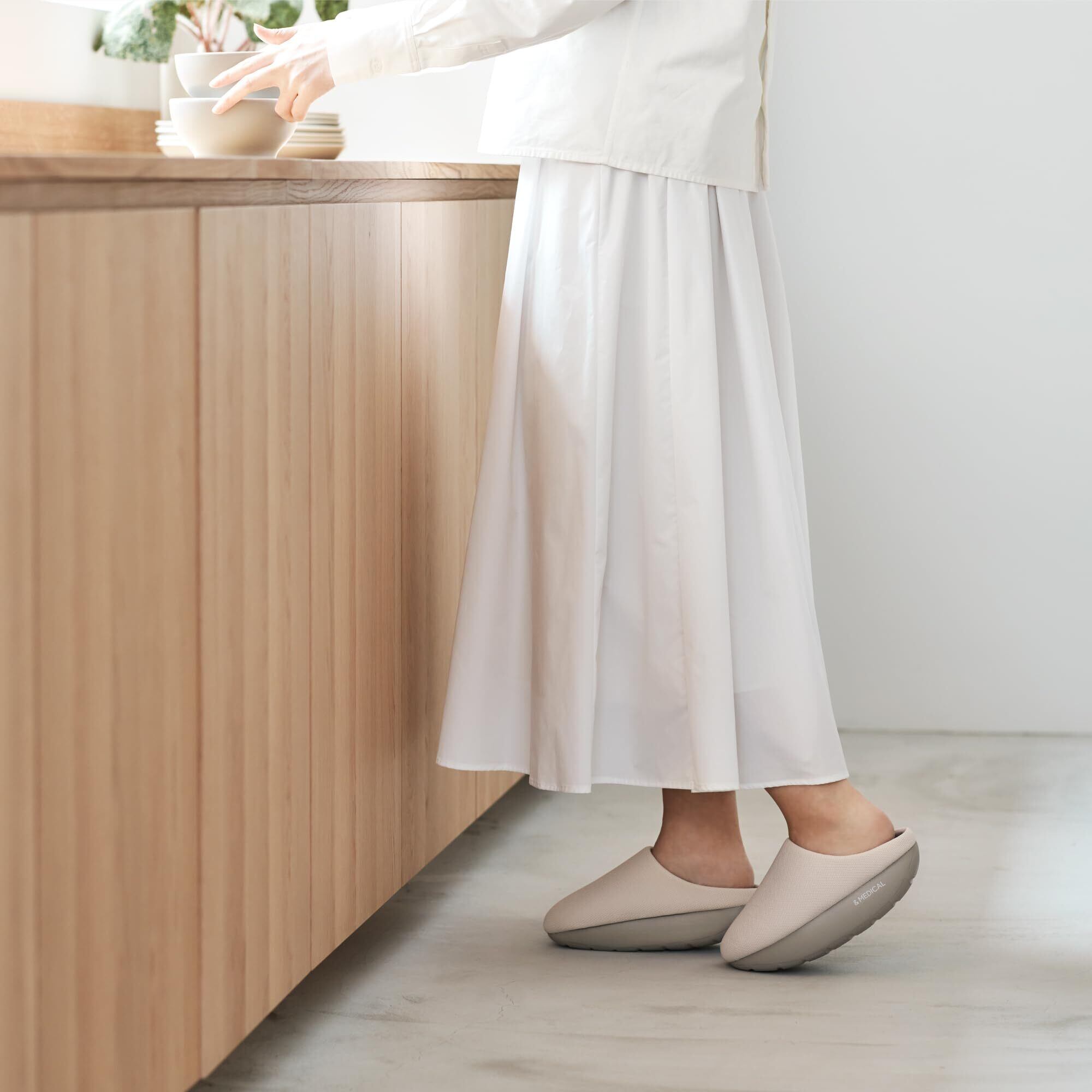 ①履くだけで体幹エクササイズ ラウンド状にカーブしたアウトソールが、かかと着地からつま先での蹴り出しまでをガイドし、正しい歩き方へと導きます。下半身の筋肉を効率的に使って歩けるようになるため、いつもの何気ないおうち歩行が自然とフィットネス に変わります。 また、不安定なソールが体幹を鍛えるエクササイズにもなるため、運動不足の方やパフォーマンスアップしたい方にもおすすめです。 KAMOLEG2.0は、歩きやすさ・動きやすさを追求し、アウトソールの硬度を60度から45度へ落として少し柔らかくしました。これにより、足への衝撃を吸収しやすく負担軽減につながるため、長く履いていても疲れにくくなりました。