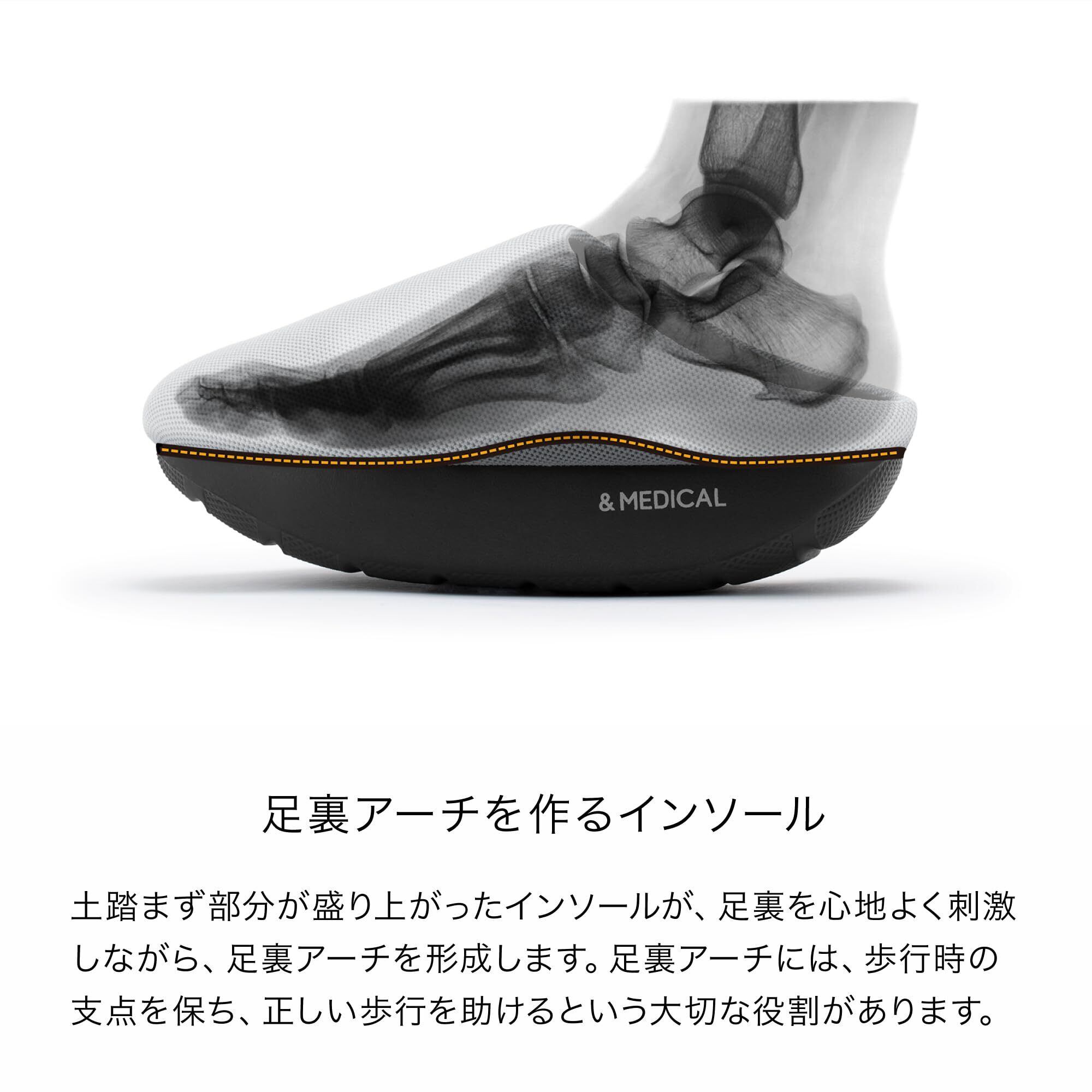 ②足裏アーチを作るインソール 土踏まず部分が盛り上がったインソールが、足裏を心地よく刺激しながら、足裏アーチを形成します。足裏アーチには、歩行時の支点を保ち、正しい歩行を助けるという大切な役割があります。KAMOLEGを履くだけで、背筋がスッと伸びて美しい立ち姿勢になるのを実感できます。