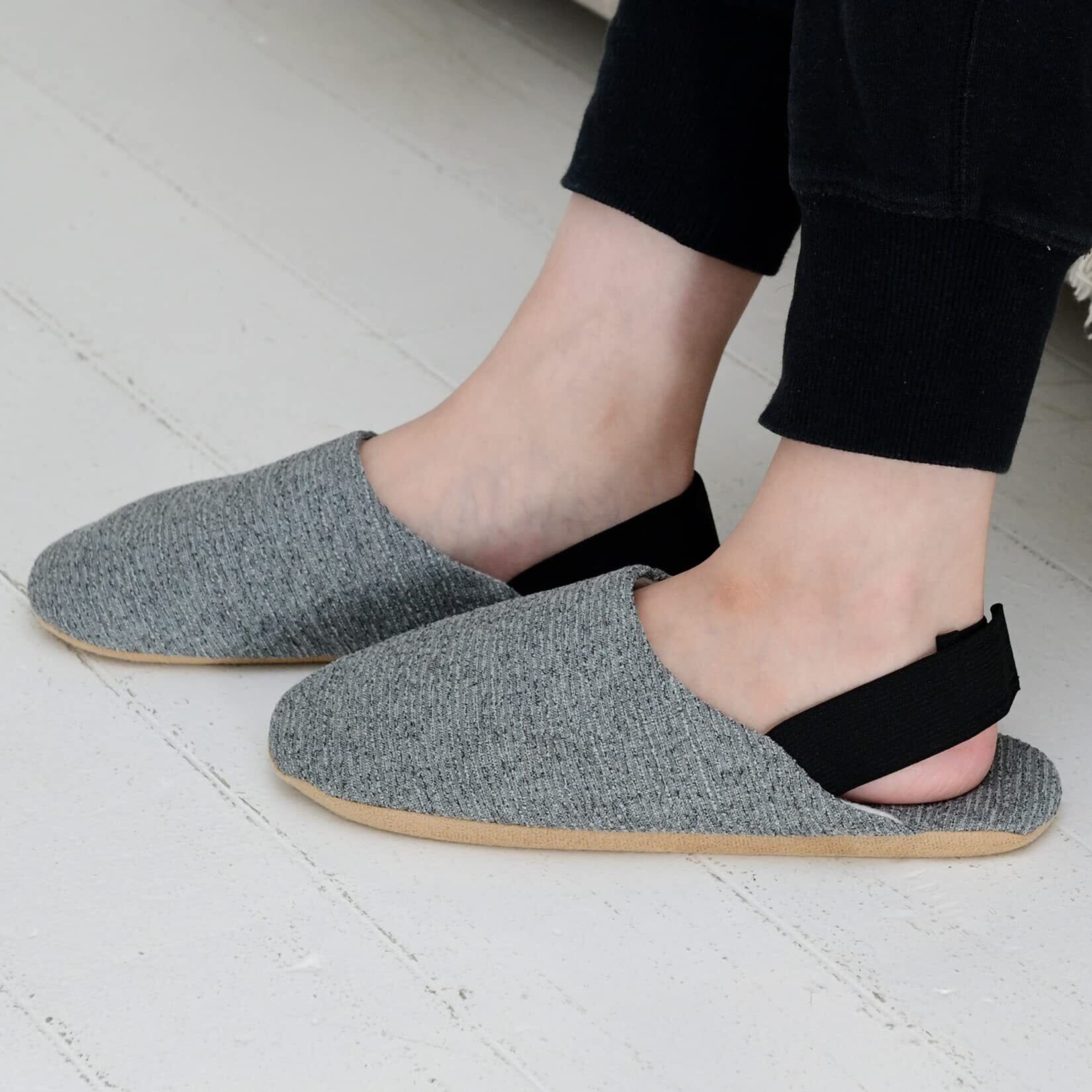 「かかと部分にはゴムが施されており、脱ぎにくい設計が特徴です。家の中での移動はもちろん、避難時にも安定して履けるため、高齢者やお子様にも安心です。」