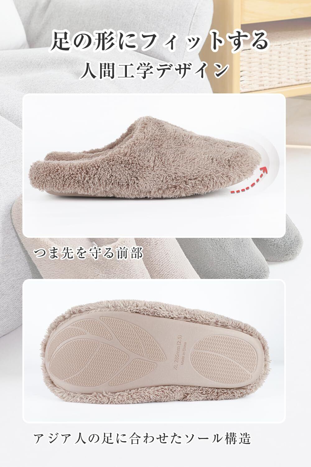 【暖かい冬は足から!寒い冬への備えこそのルームシューズ】「商品仕様のご注意」 ※5サイズがあり、足適合の範囲:S(約20~21cm)M(約21.5~22.5cm)L(約23.5~25.5cm)XL(約26~27cm)2XL(約27~28.5cm)※お客様への知らせ:冬用スリッパの靴底に記載されている「235」ような数字は靴底の長さを表示しており、ルームシューズのサイズを表すものではございません。甲高の方はワンサイズ上をお選びください。足適合の範囲を参考して室内スリッパをお選びなさいませ。「商品素材」トップ&インソール:コーラルフリース、ソール:TPR素材