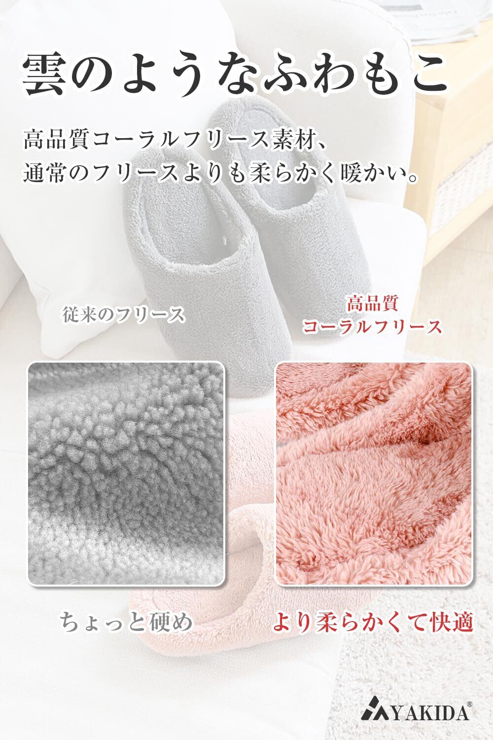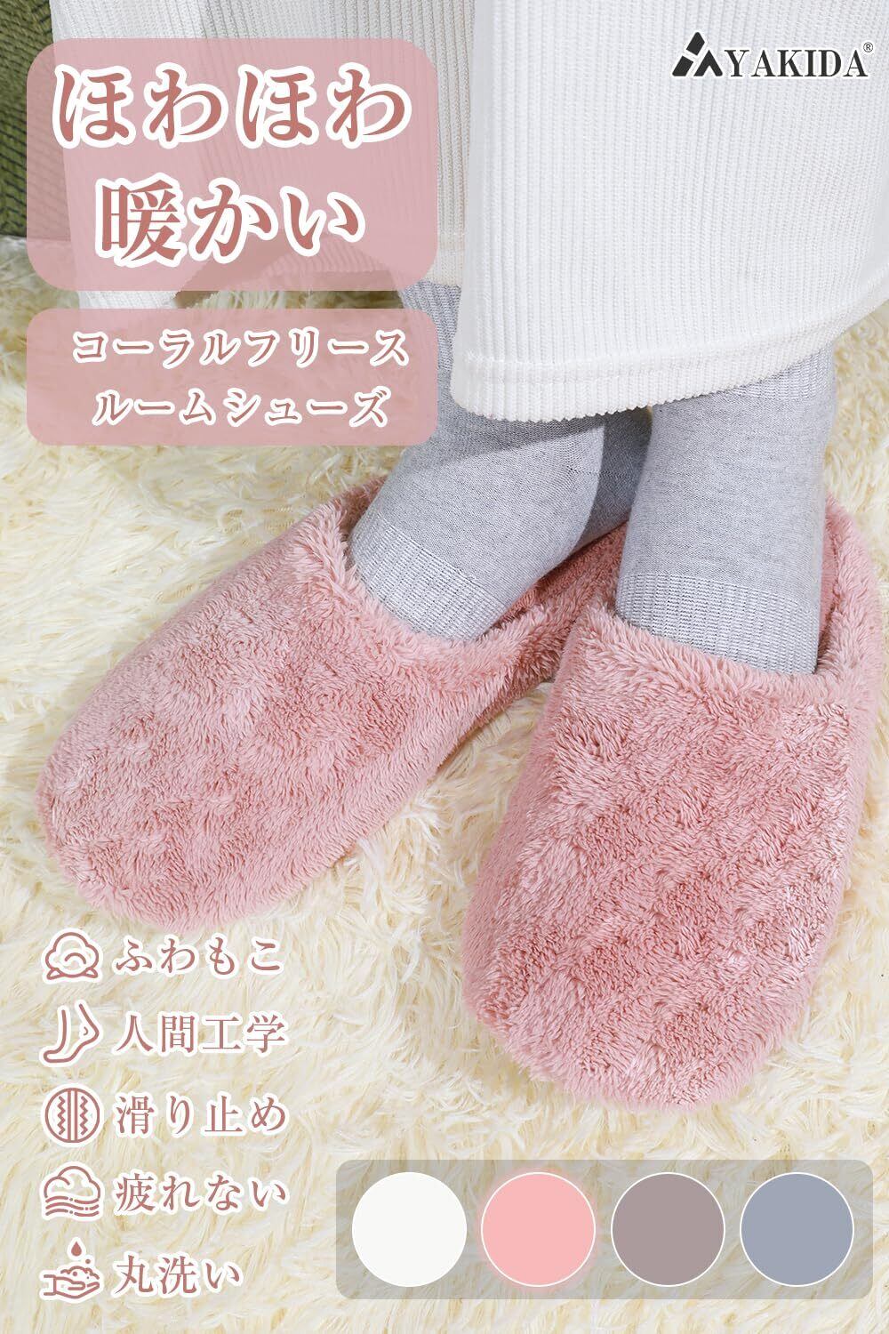 「『[YAKIDA] ルームシューズ』は、冬の寒さから足をしっかり守るもこもこのルームシューズです。人間工学に基づいた設計で、温かいだけでなく、快適な履き心地を追求しています。防寒性能が高く、来客用としても大変便利です!」