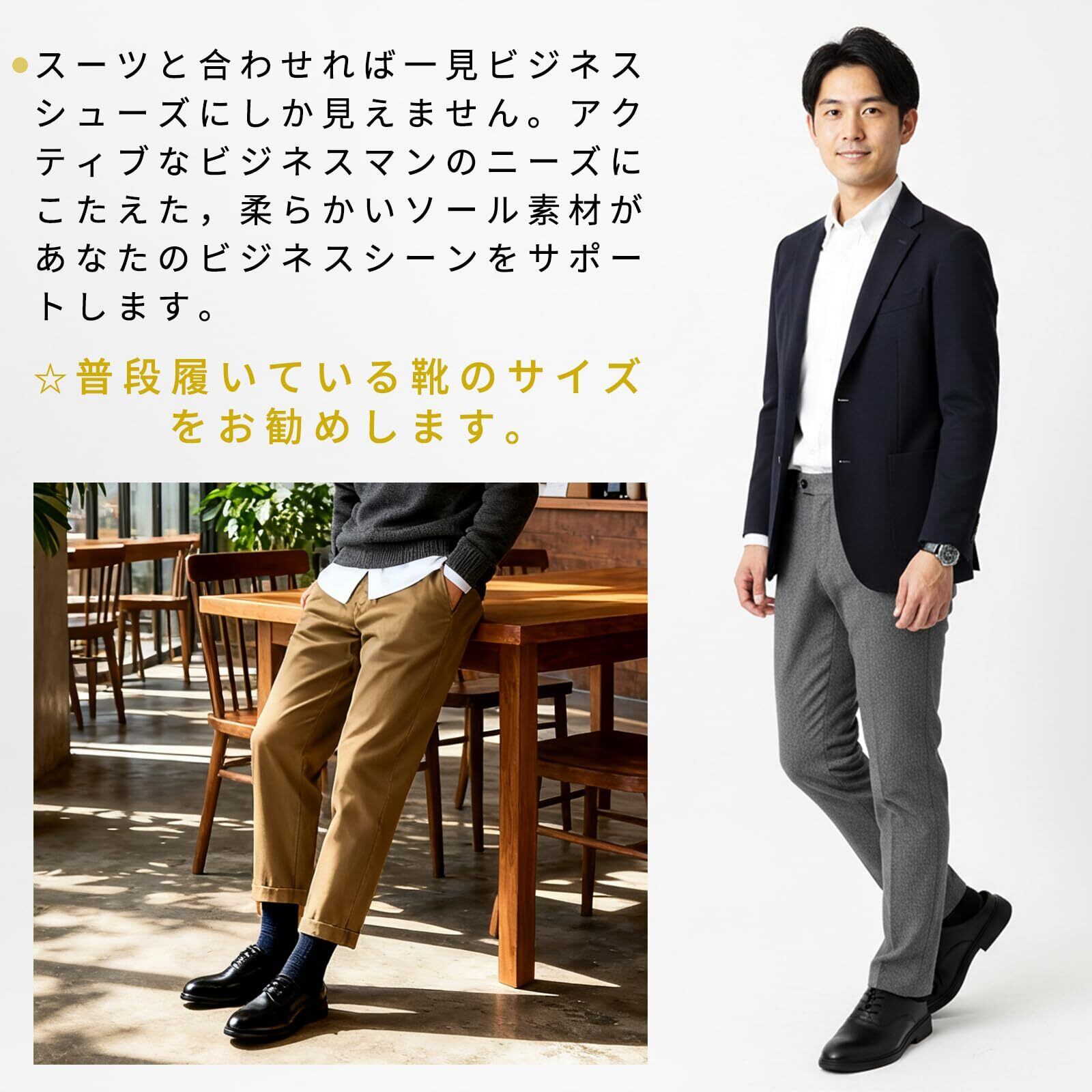 【プロフェッショナルな佇まいと快適性を両立】 急な来客やミーティングの際にも、見た目はまるでビジネスシューズのように上品でスタイリッシュ。だらしない印象を与えず、足元からプロフェッショナルな印象を演出します。オフィス内ではスッと履けて、急な対応にもサッと動ける快適設計。スリッポンタイプで出張先のホテルや新幹線内でも瞬時に履き替えができ、社内履きやランチなどのちょっとした外出にもぴったり。スーツにも自然にフィットし、ビジネスシーンに洗練されたスタイルを添えます。