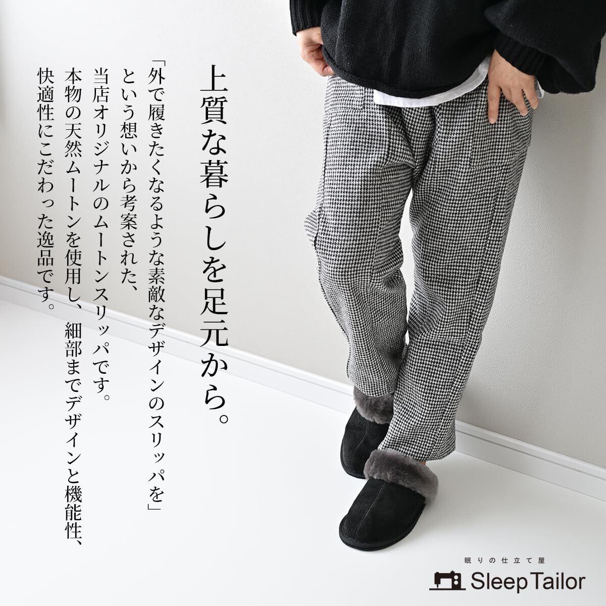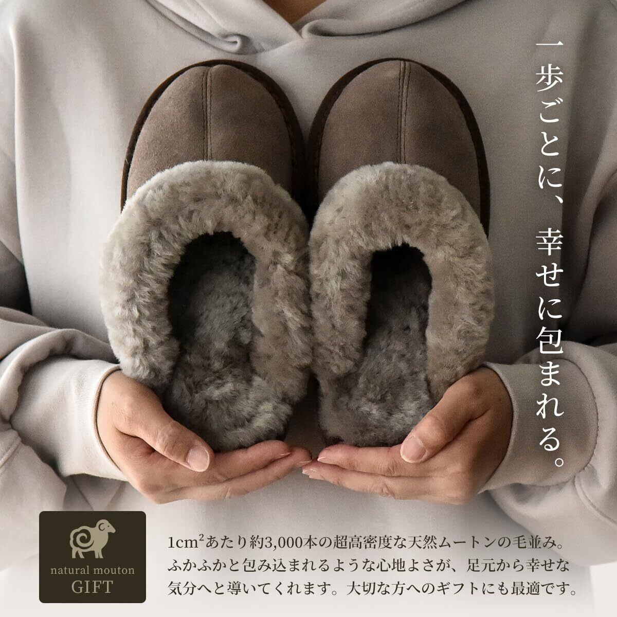「天然素材のムートンは、通気性に優れているため、長時間の着用でも蒸れを感じにくいのが特徴です。足元がいつでも心地よい状態を保ち、快適に過ごせます。おしゃれさと機能性を兼ね備えたスリッパです!」