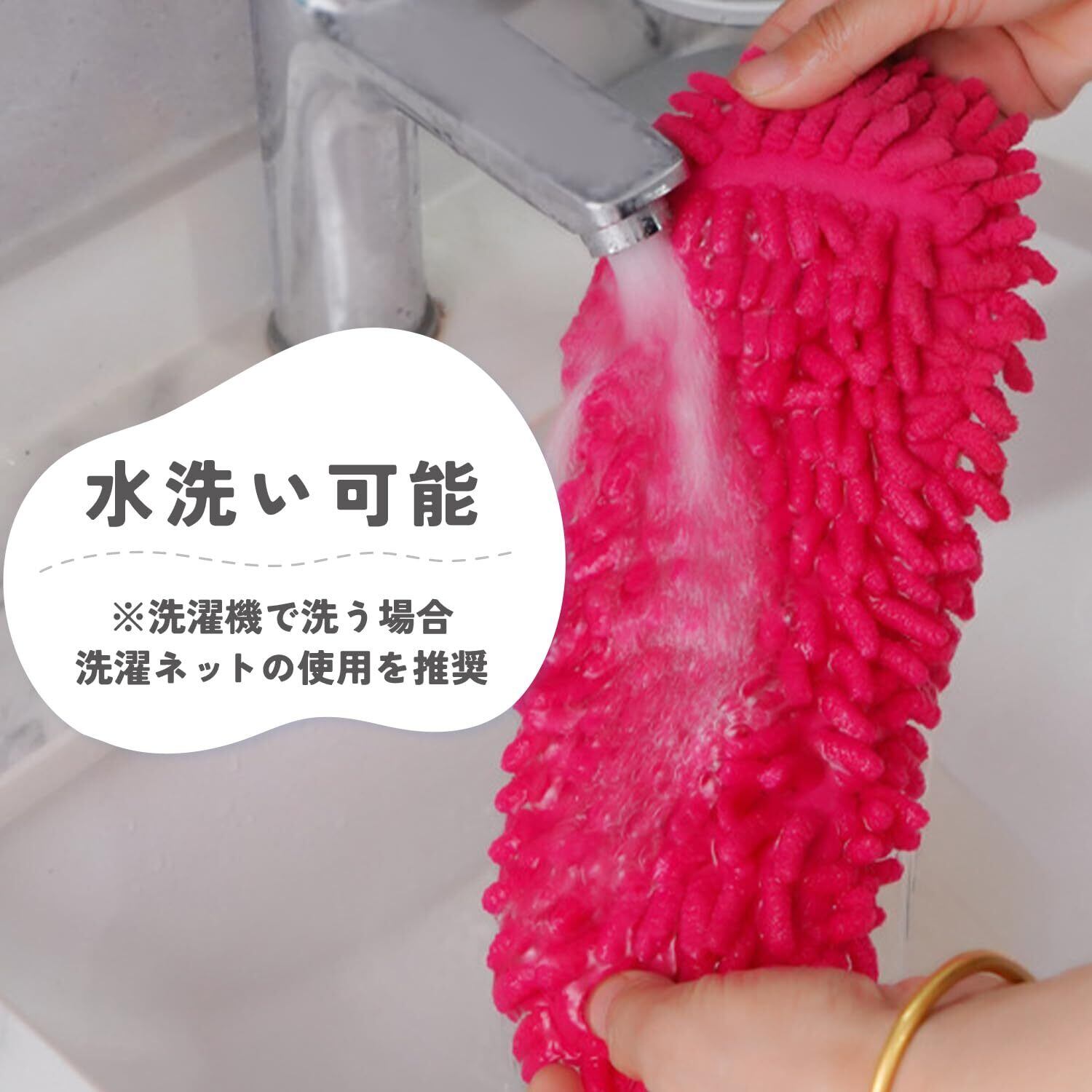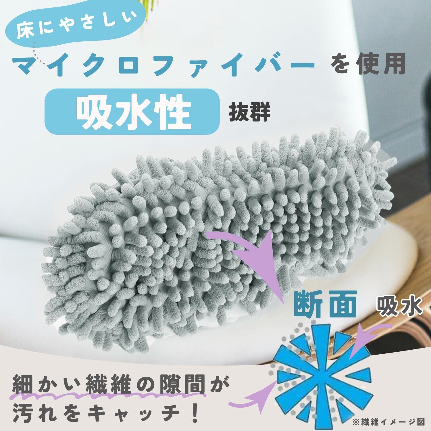 「モップスリッパには、吸水性の異なる2タイプをご用意しました。水滴をしっかり吸収するタイプは、台所や水回りの後片付けに最適!もう一つのタイプは、一般的なホコリ取りに使いやすく、シーンに応じて使い分けができる便利さです。」