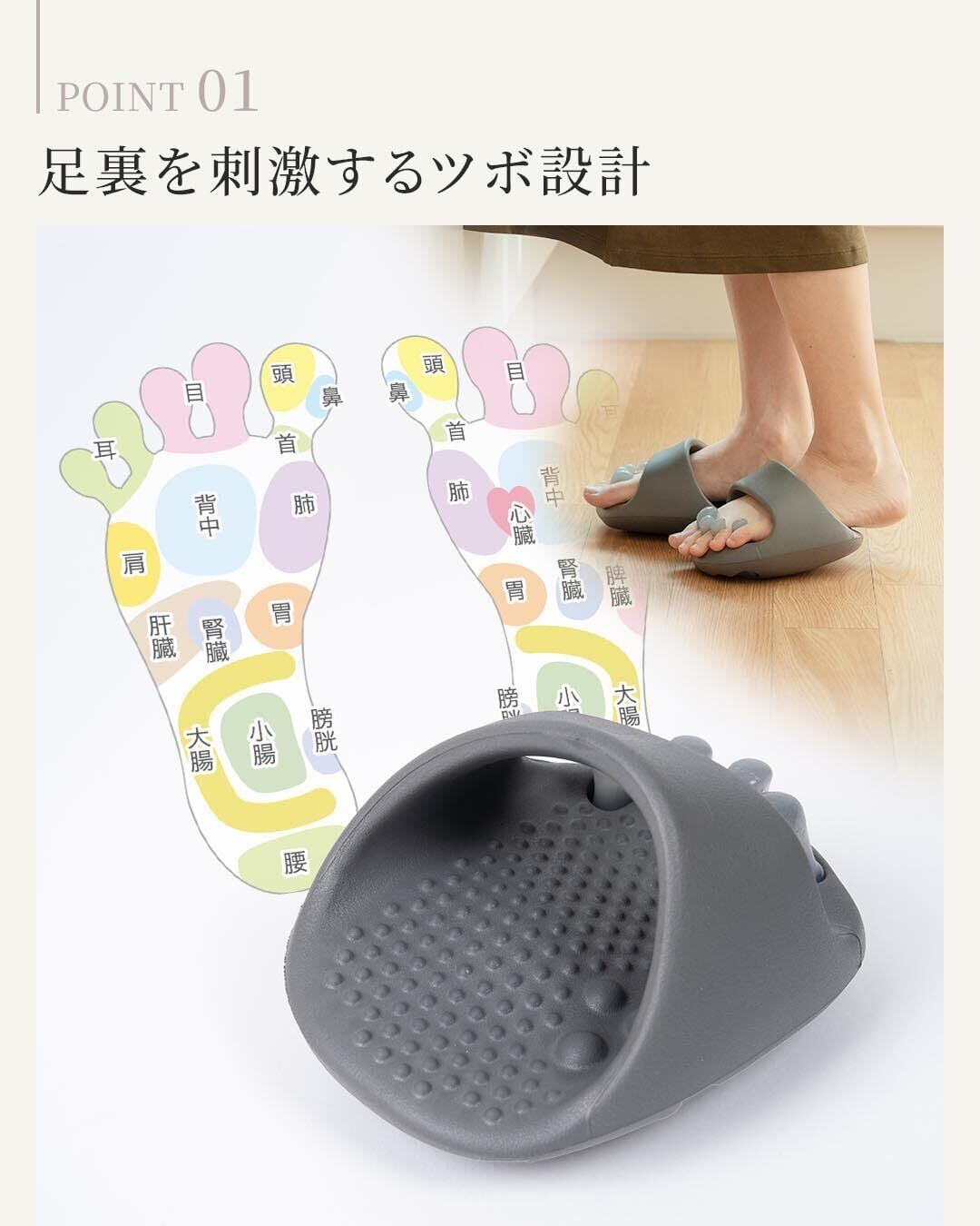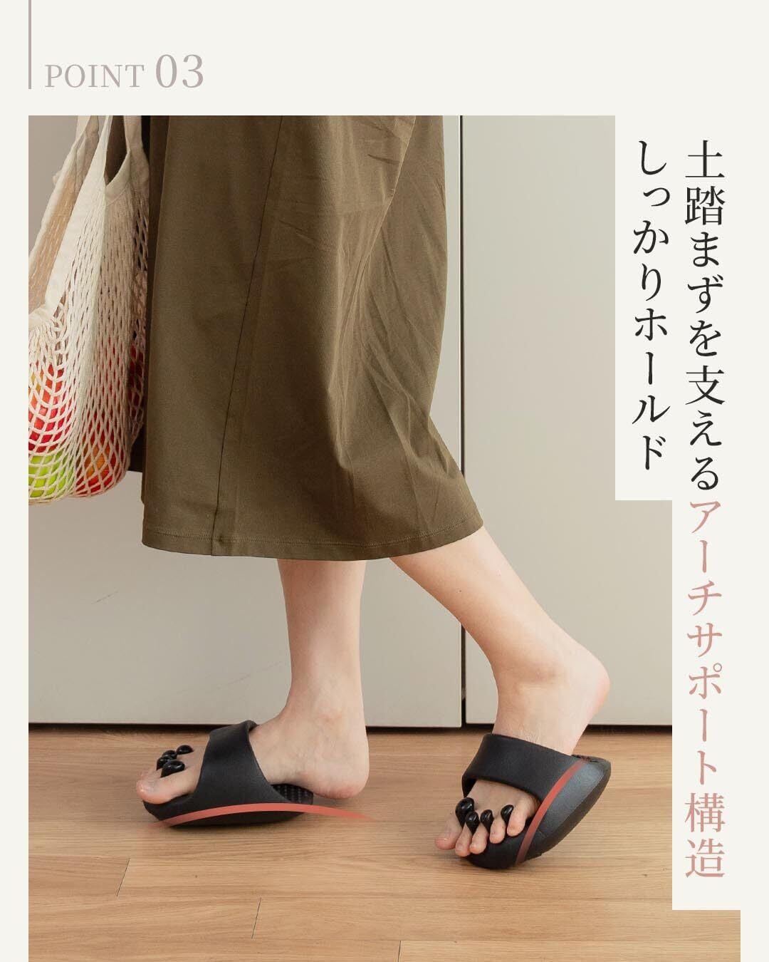 歩くだけで心地よく、すっきりとした印象へ 足裏の凹凸がやさしく刺激を与え、歩行時に軽やかな感覚をサポート。 姿勢を意識しやすい構造設計 土踏まずを支えるアーチサポート構造で重心が安定しやすく、自然とすらっとした立ち姿・歩き姿へと導きます。 美しさと快適さの“ながら習慣”に 家事や仕事中も、普段の歩行が気軽なケアタイムに。毎日の動きに“自分をいたわる時間”をプラス。 忙しくても取り入れやすい 履くだけの簡単仕様だから、ライフスタイルに取り入れやすい。特別な準備やスペースも必要ありません。 一日の終わりにリラックスタイムを 足指ストレッチ設計と足裏へのやさしい刺激で、ふっと軽くなるような心地よさをサポート。 ルームウェアにも馴染む洗練デザイン シンプルで上品な5色展開。毎日履きたくなるようなデザイン性も魅力。 フリーサイズで選びやすい やわらかい足指パッドが足の位置を安定させ、さまざまな足の形にフィットしやすい仕様で快適な履き心地。 丸ごと水洗いOK!毎日清潔に使えて経済的 水洗い可能だから、いつでも清潔に使えます。繰り返し使用できるので、コスパも良く、毎日心地よくケアできます。