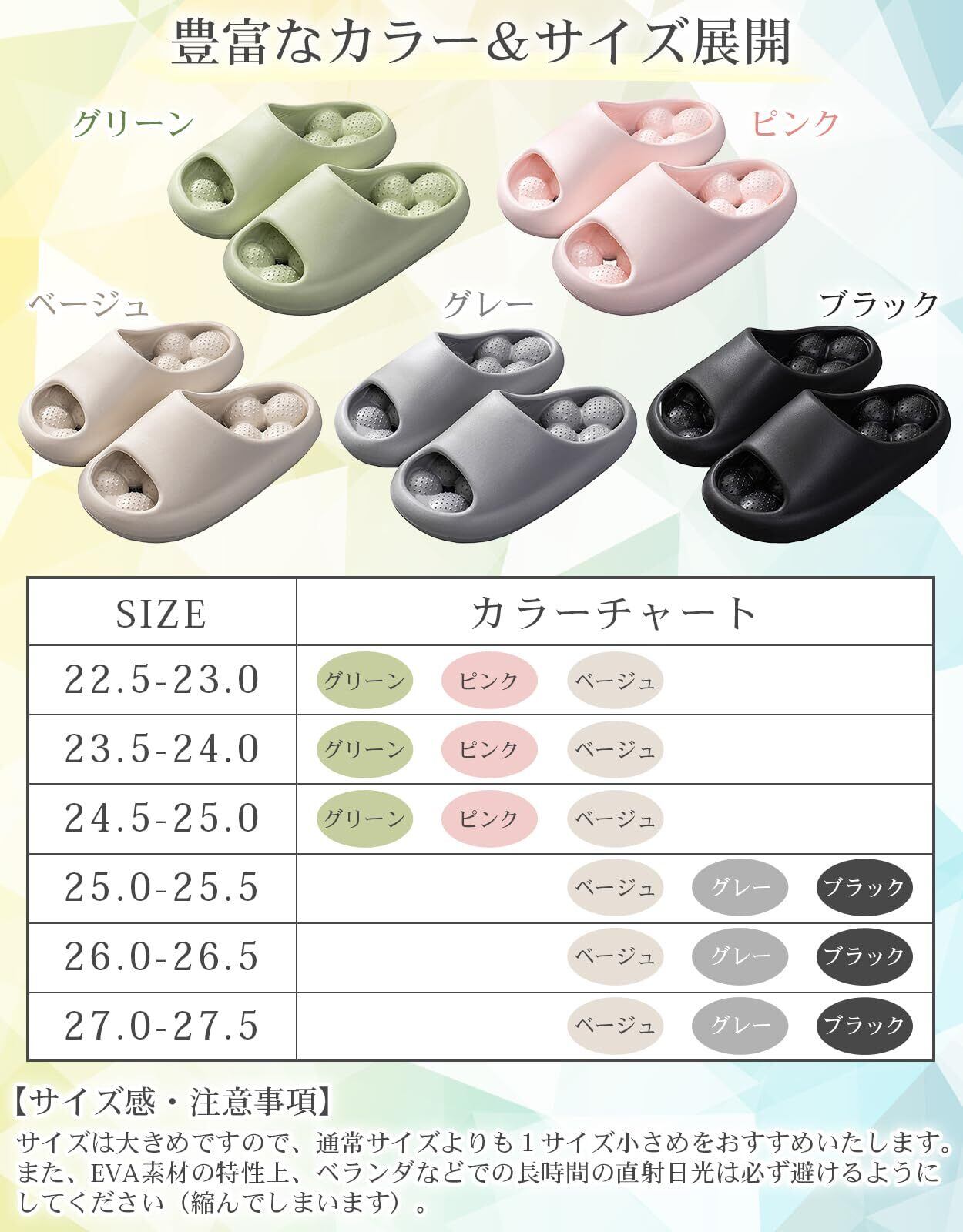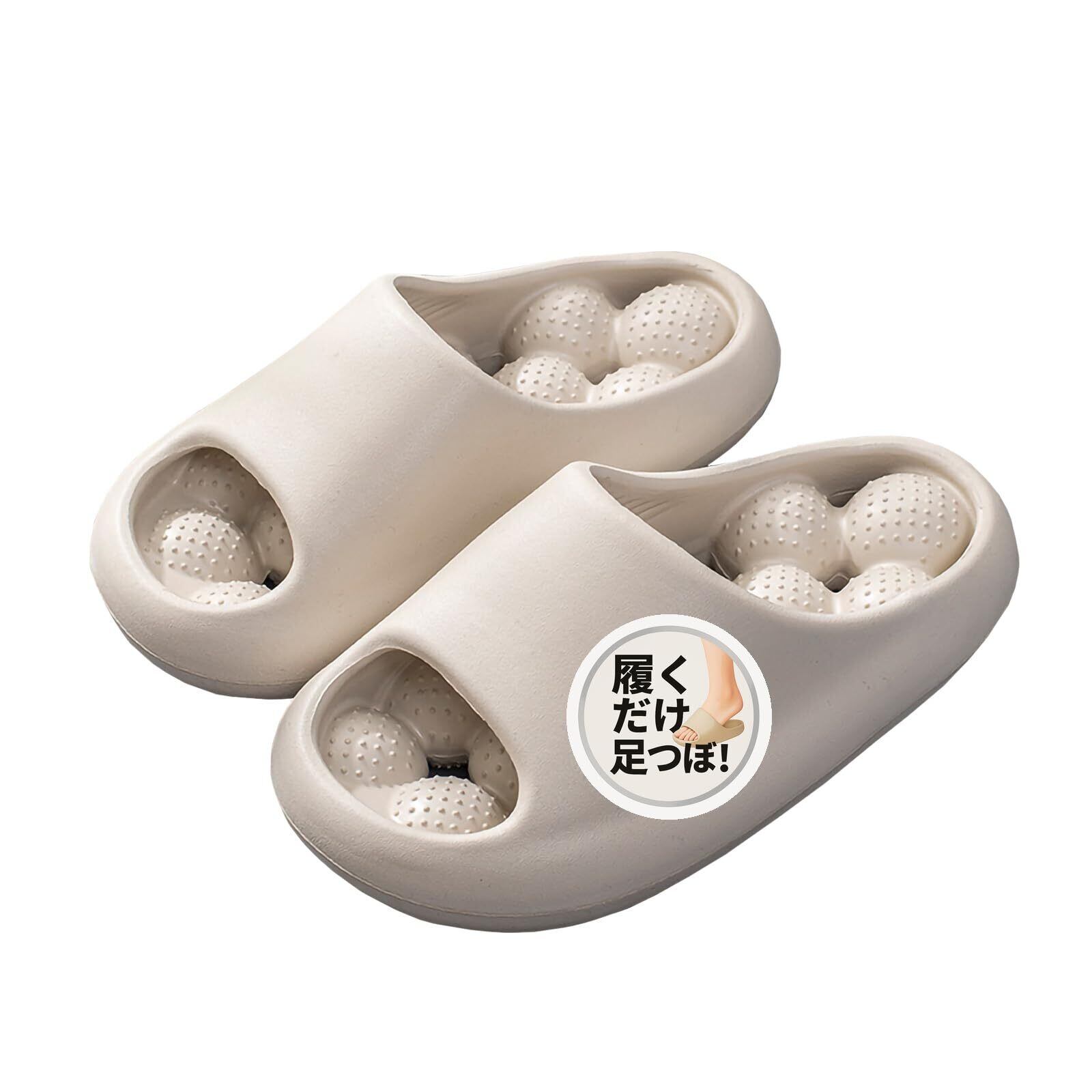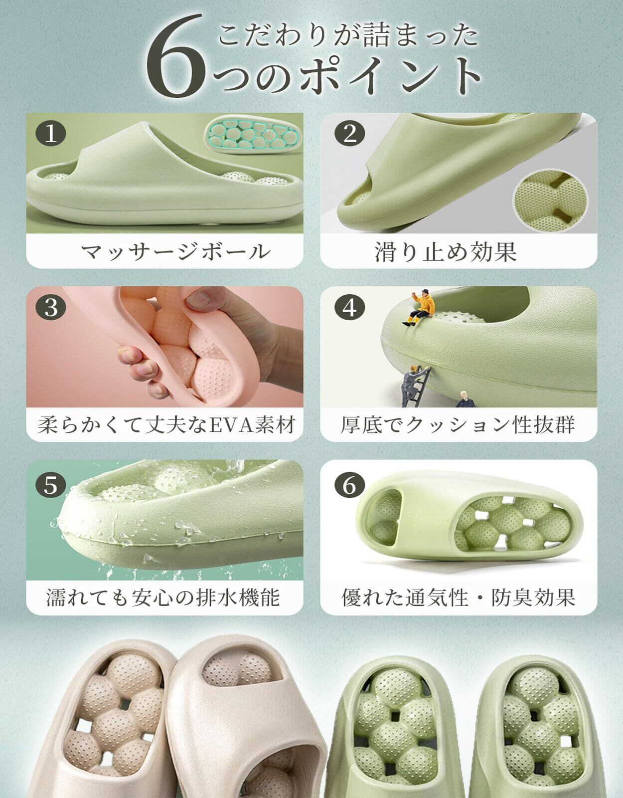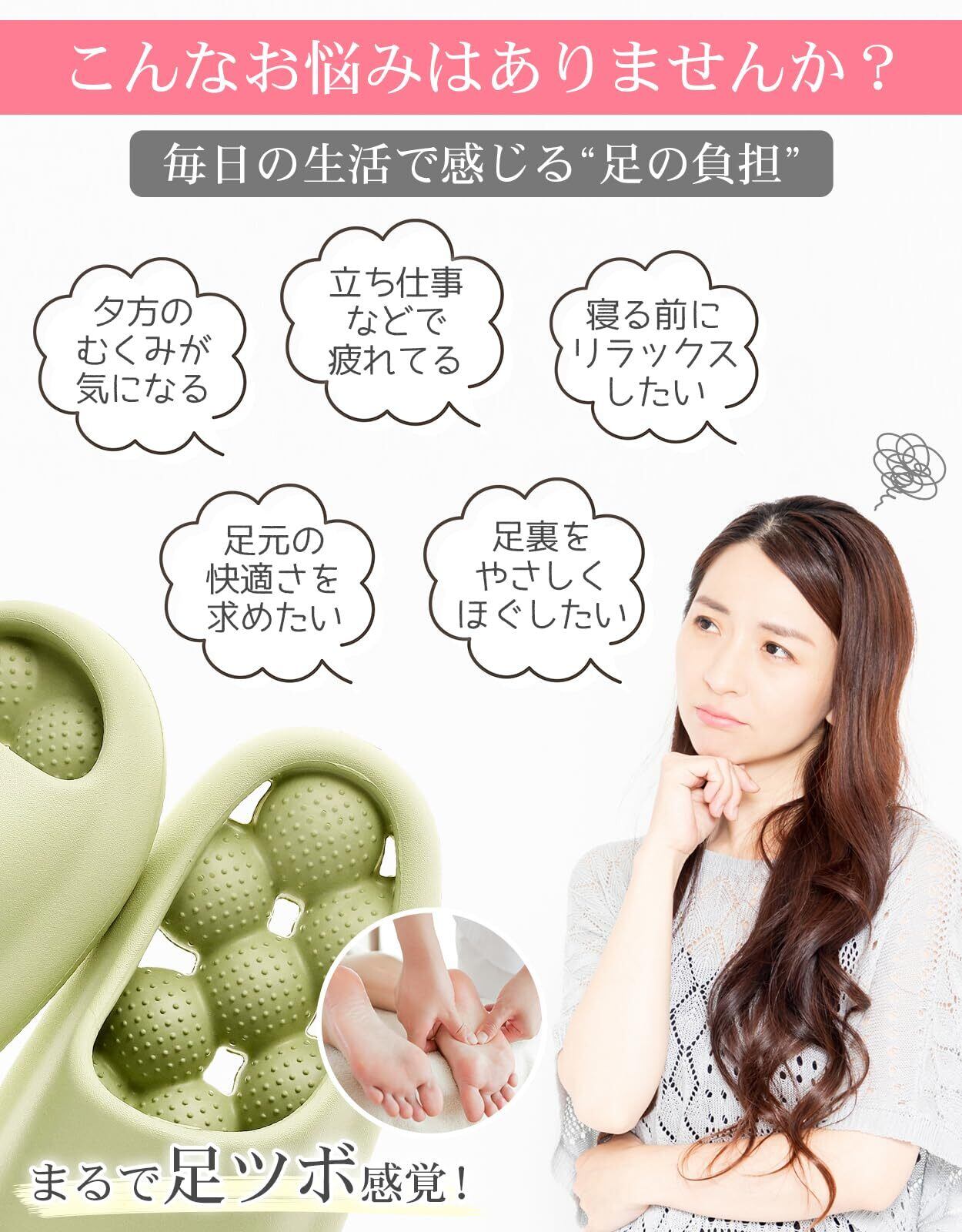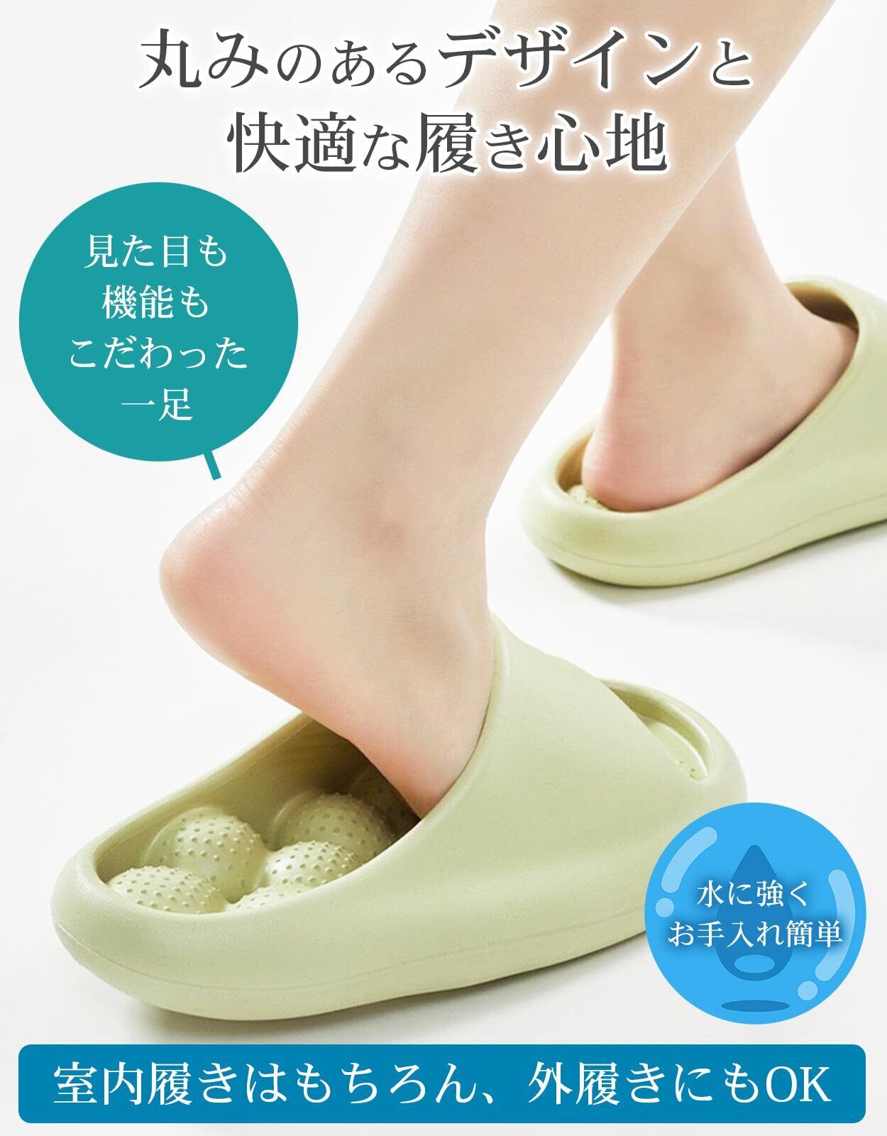 「このサンダルは独自の足ツボデザインを採用しており、足裏を適度にマッサージしながら強化します。長時間の立ち仕事や運動後でも、快適な履き心地を実現し、疲れを軽減します。」