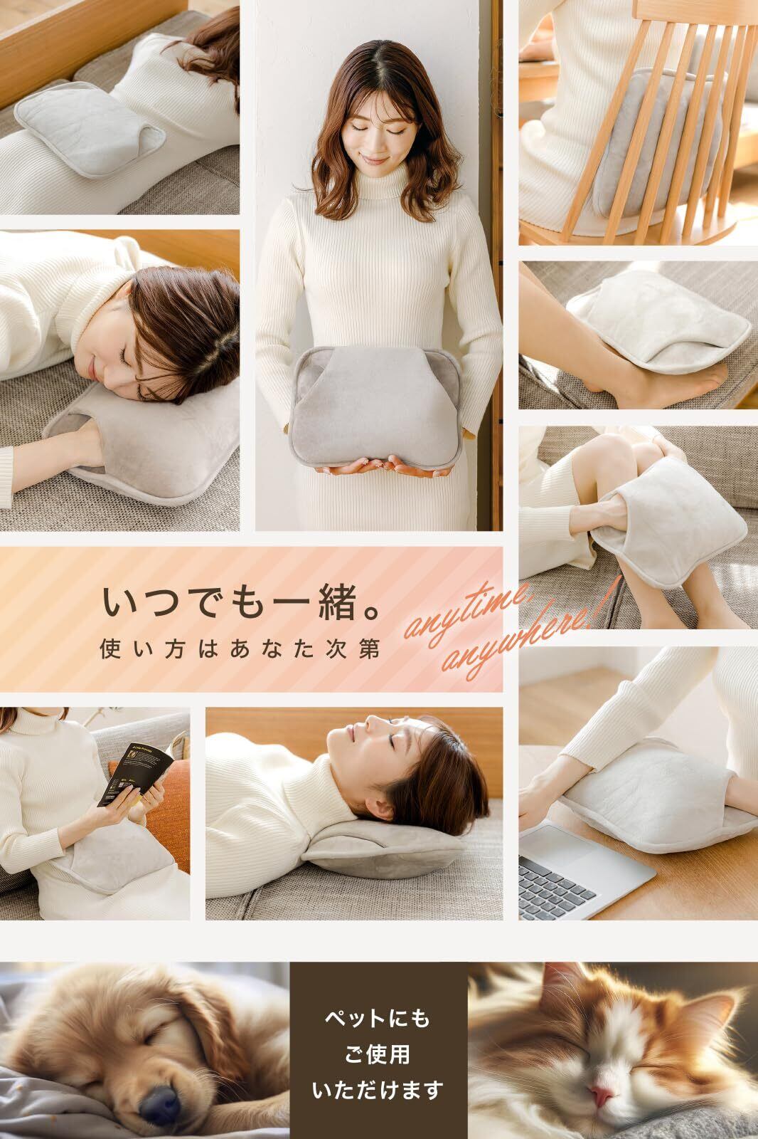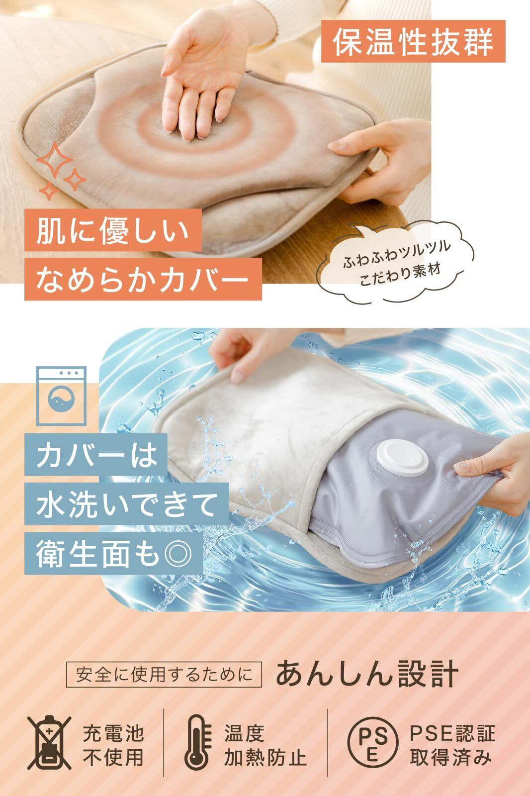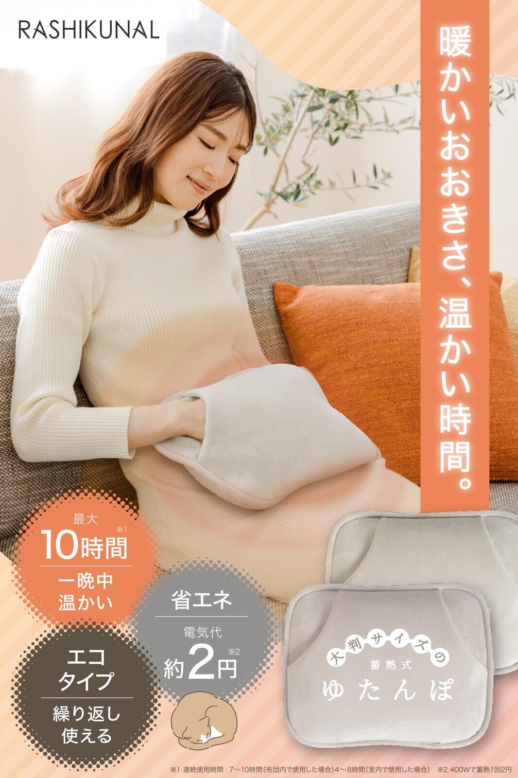 「大きいサイズの特徴を活かし、最大で長時間も温かさを持続! 蓄電式だから、何度でも使え、急速充電でわずか15分で準備完了。ベッドやソファで使用する際にも、じんわりと肌を包み込み、一晩中温もりが続きます。」