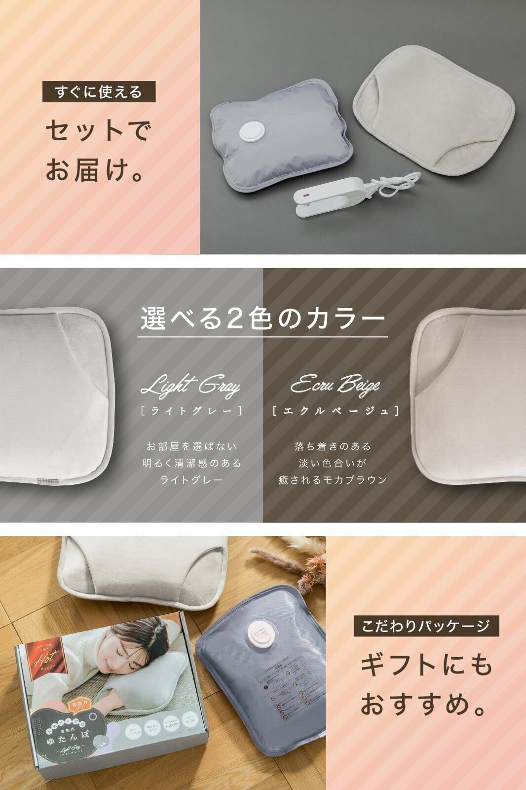 【お世話になったあの人への ギフト に】老若男女問わず、 プレゼント にもおすすめのパッケージデザイン。保温カバーにもこだわりました。シンプルでインテリアになじみやすい2色展開。ふわふわツルツルで保温性バツグン、水洗い可能で衛生的。清潔で快適なホカホカタイムをお楽しみください。