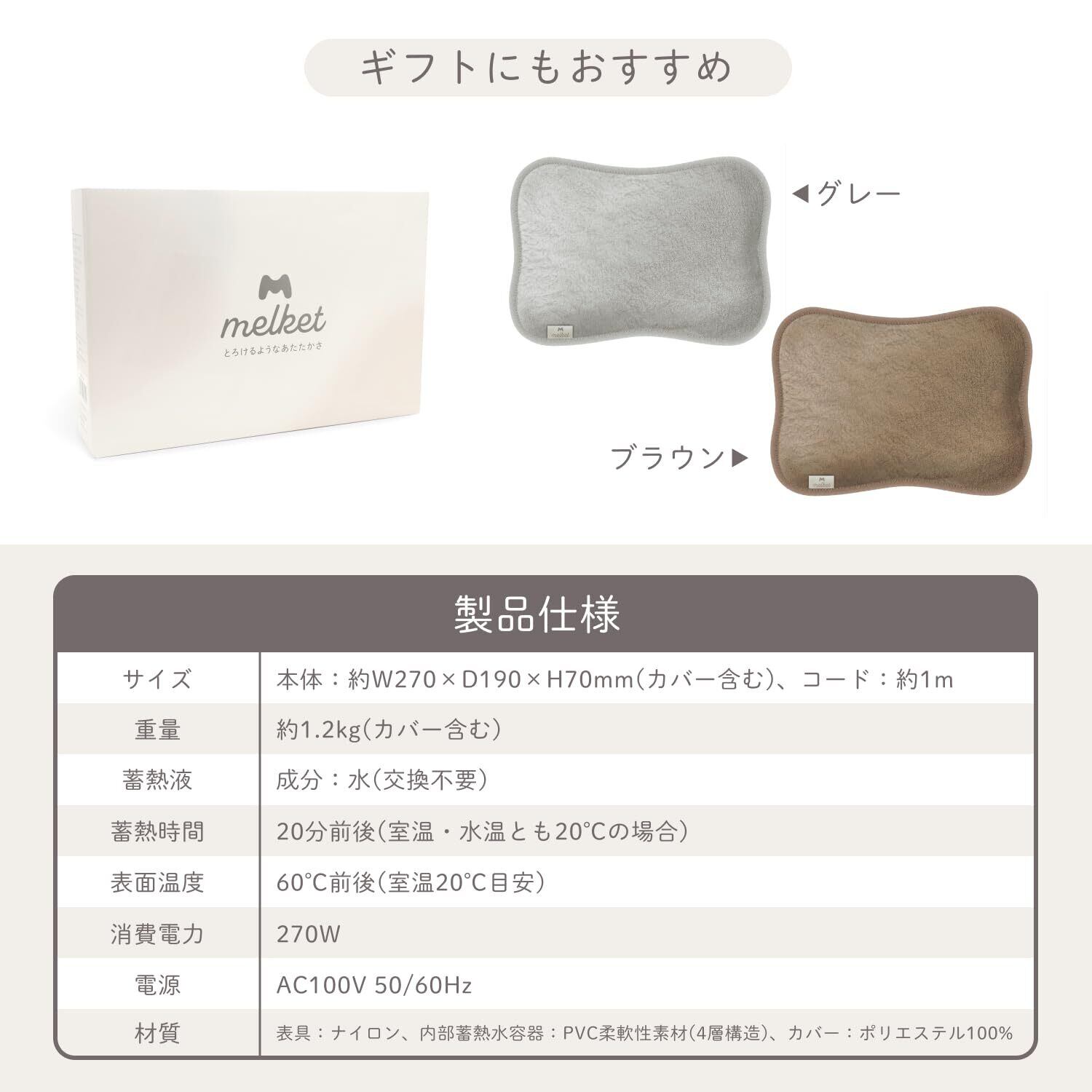 【ギフト仕様パッケージでプレゼントにも】大切な人への贈り物に選んで頂きたい想いから、パッケージデザインにもこだわりました。※ギフト包装をご希望の場合は、注文画面で「ギフトの設定」をお選びいただくか、贈り主の方が受け取り後にラッピングいただくことをご検討ください。【商品仕様】・本体サイズ/約W27×D19×H7cm・コード長さ/1m・電源/AC100V 50/60Hz・消費電力/270W・蓄熱通電時間/約20分前後(室温・水温とも20℃の場合)・最高表面温度/約60℃前後(室温20℃目安)・期間/1年間 ※製品のにおいについて:本体が温まると、PVC素材特有のにおいがする場合がございます。カバーを付けることで軽減しますが、あらかじめご了承くださいませ。