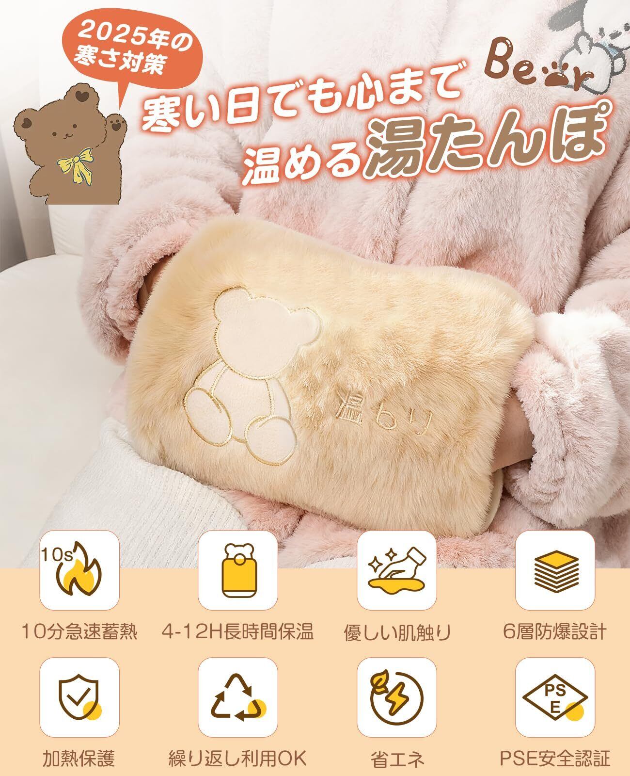 「『湯たんぽ 充電式』は、手間いらずで簡単に暖かさを提供する、これまでにない便利なアイテムです。4〜12時間の長時間保温が可能で、お湯を準備する必要がなく、寒い季節を快適にサポートします。特にふわふわの保温カバーが体に心地よくフィットし、リラックスしたひとときを演出します!」