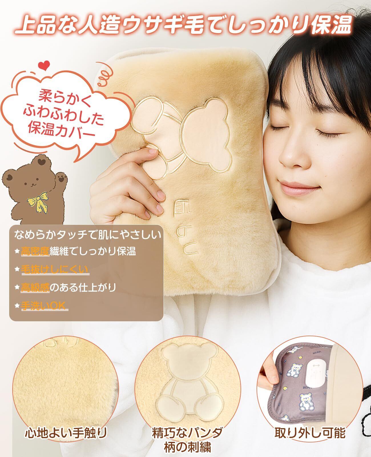 【ふわふわした人造ウサギ毛のカバーでしっかり保温】高品質な人造ウサギ毛の素材を使用し、まるで本物のうさぎの毛のような柔らかさです。毛並みがふわふわで、触れるたびに癒される心地よさです。やさしい色合いで見た目もかわいく、カバーには手を入れられるポケット付き。冷えた手をあたためながら、リラックスタイムにもぴったりです。カバーは取り外して洗濯でき、いつでも清潔にお使いいただけます。