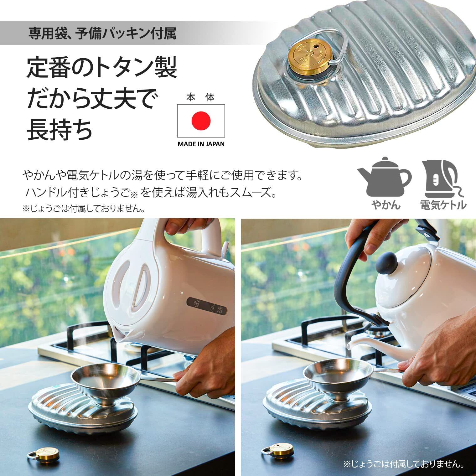 【注意事項】1、直接手で触らないでください。熱湯の入った湯たんぽは高温です。素手で触るとやけどをしますので必ずミトンなどをご使用ください。2,キャップは上向きで仕様してください。下向きの場合は何からの衝撃でキャップが緩み湯漏れが生じる危険があります。