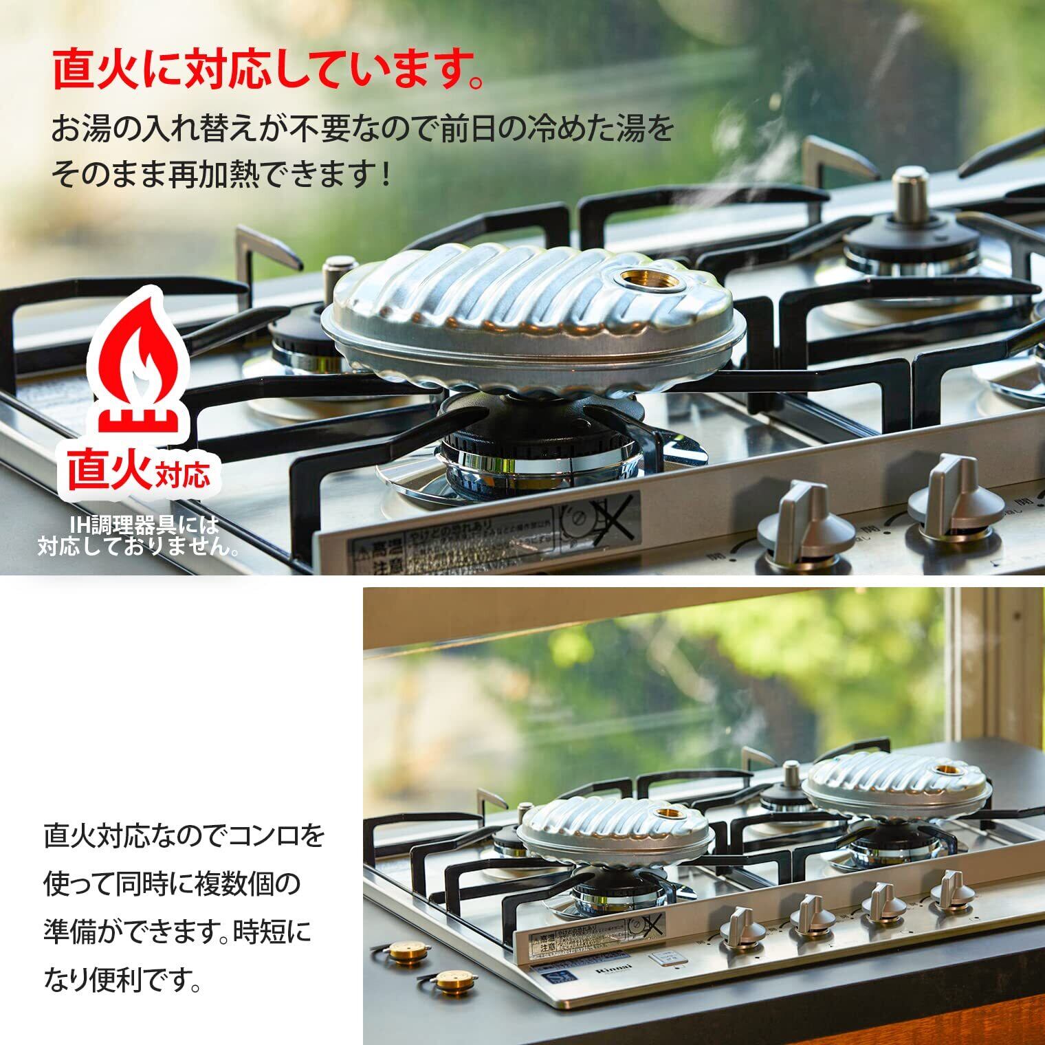 【お湯の入れ替え不要】直火対応なので、お湯の入れ替えが不要。前日の冷めた湯をそのまま再加熱して利用できます。コンロを使って同時に複数個準備ができるので、時短にも便利!