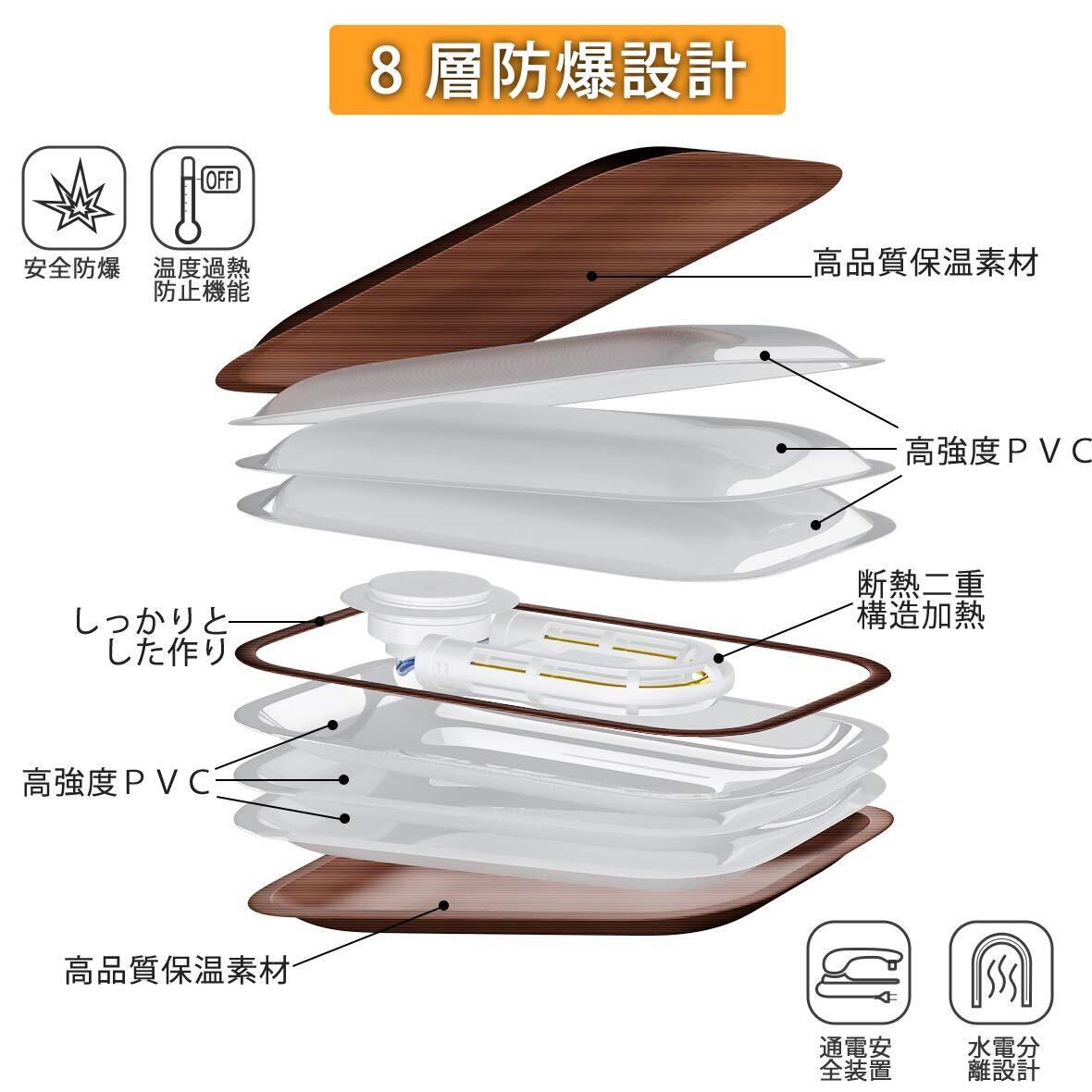「過熱防止機能と防爆安全措置を備えているため、安心してご使用いただけます。電気湯たんぽでも、運転中に不安を感じることなく温かさを持続することができます。高品質な素材と設計で、耐久性も抜群です。」