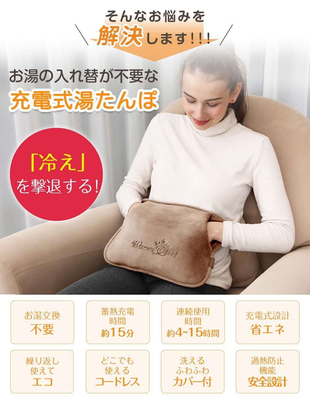 「この湯たんぽは、わずか2分の急速充電で、最大15時間もの保温が可能です。お腹や背中、指先、足元など、冷えやすい部位をやさしく包み込んで、寒い冬でも快適なひとときを提供します。特に就寝時やリラックスタイムに最適です!」