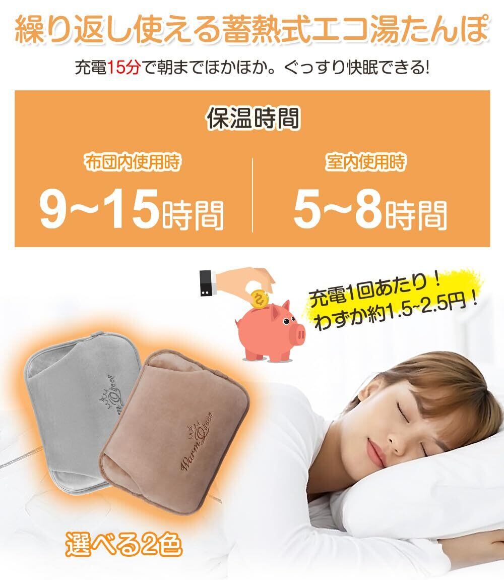 【経済的&省エネ】気になる電気代は1回の充電で約2.5円。電気を使用しているため、水道代がかからずガス代もかかりません。本体はお湯が入っているようなプニュプニュとした柔らかな感触。【優秀な保温カバー付き】ふわふわでかわいらしいデザインの保温カバーもポイントです。カバーは取り外して洗えるので、いつも清潔にご使用いただけます。