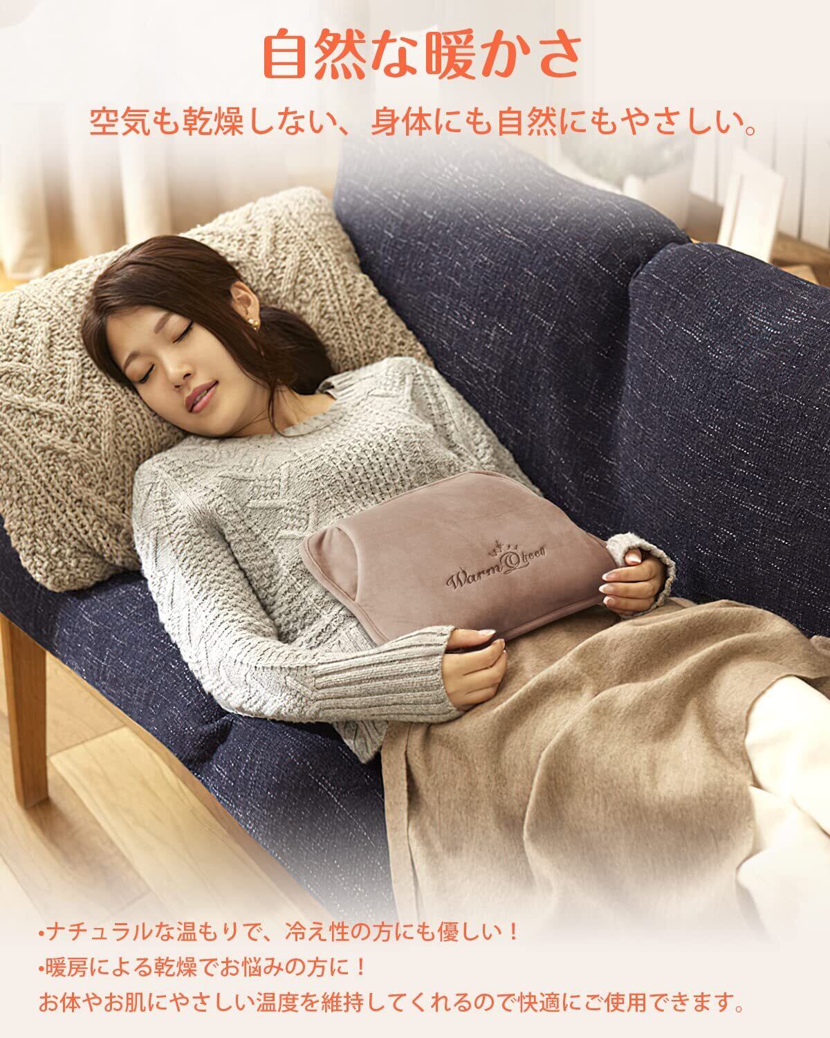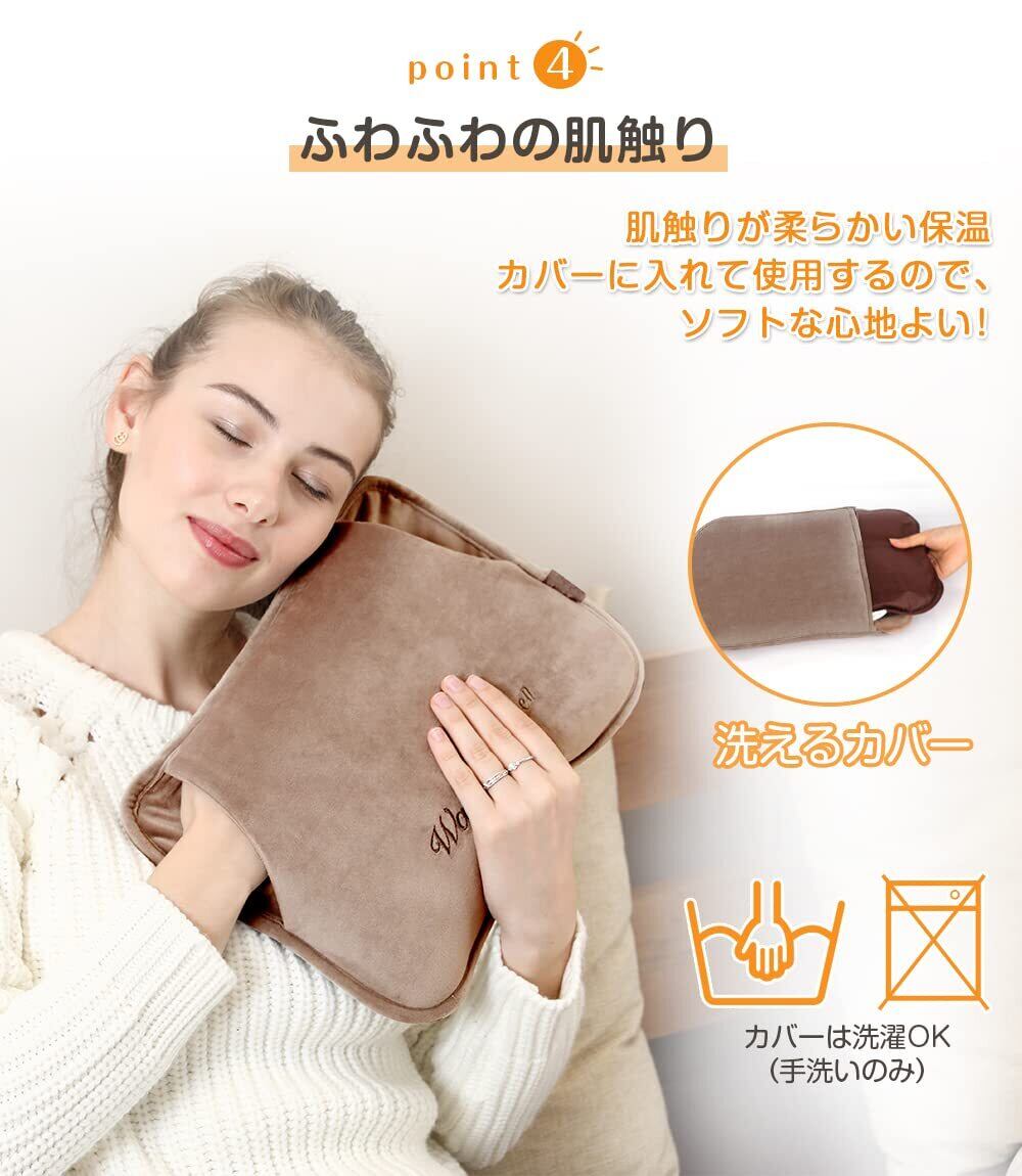 「本製品には、柔らかくあたたかいカバーが付属しており、簡単に取り外して洗濯することも可能です。見た目もおしゃれで、インテリアにもマッチします。冬のギフトとしても喜ばれるアイテムです!」