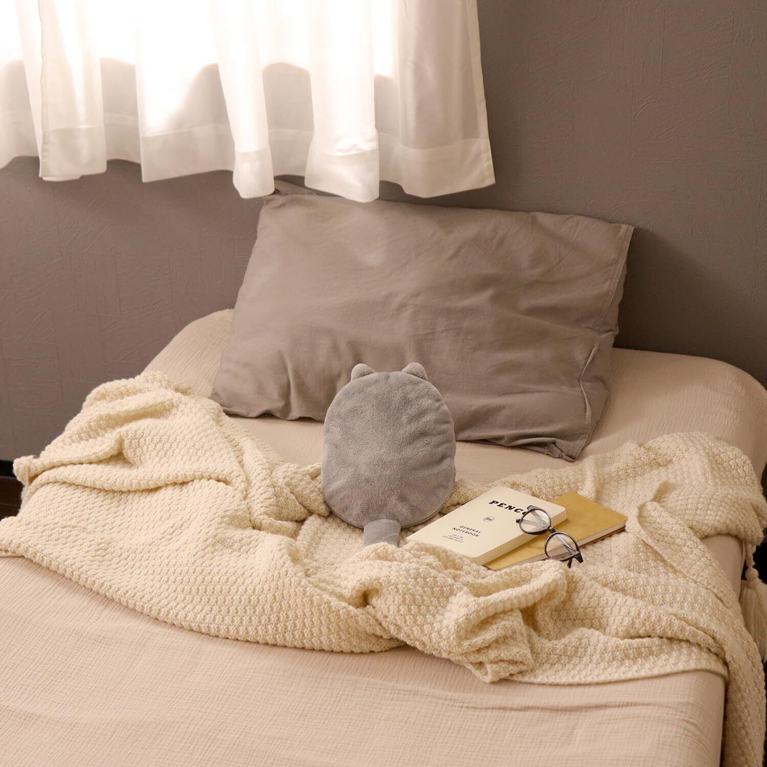 【Point2】 カバーにはそれぞれ、かわいいしっぽと耳がついています。 ふわふわで柔らかい、なでごこち。 手洗いOK!
