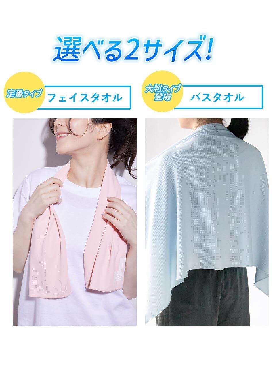 【選べる2サイズ】サイズはフェイスタオルタイプ95cm×30cmとバスタオルタイプ110cm×60cm。通勤、通学、スポーツやフェス等の熱中症対策におすすめ。