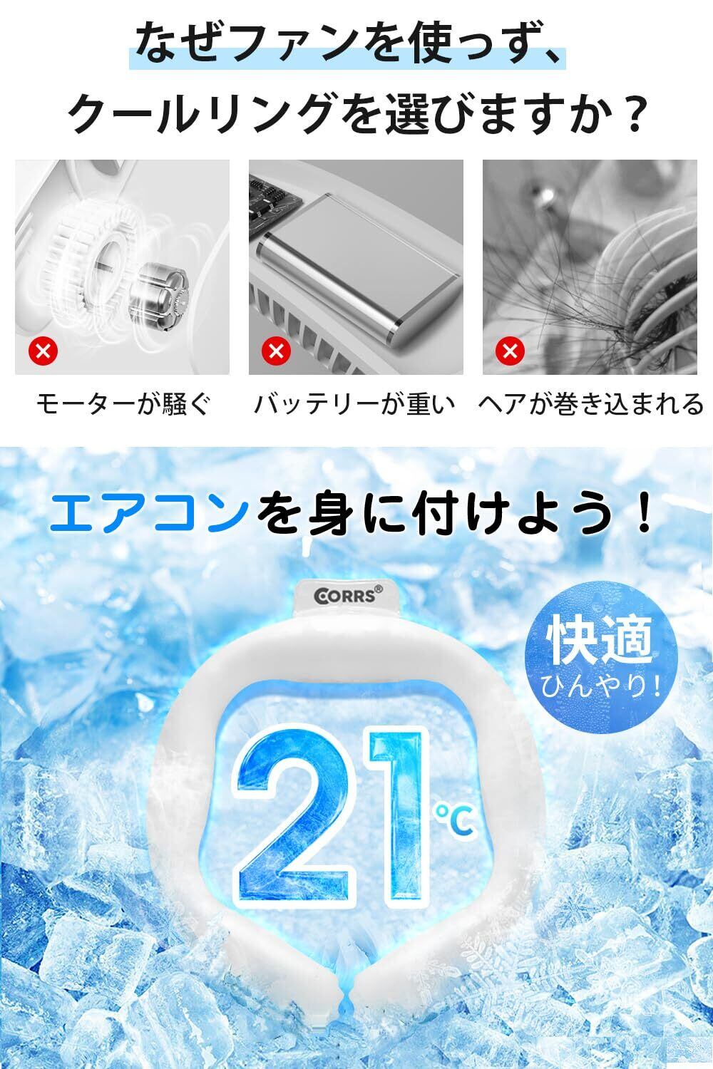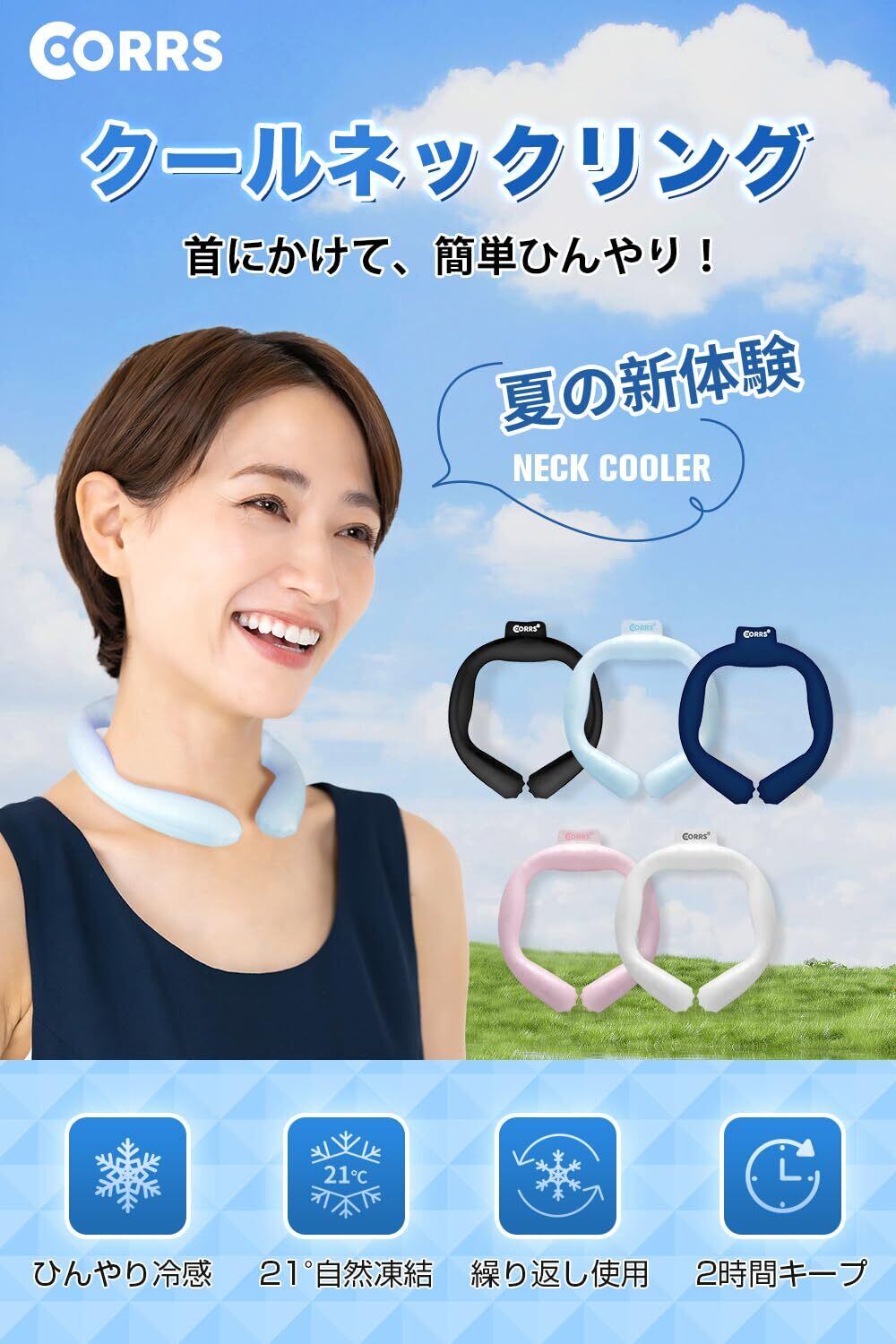 「『クールネックリング』は、暑い夏を快適に過ごすための必需品です!自然凍結技術を用いたこのネッククーラーは、首に装着するだけでひんやり感を提供し、熱中症対策にも最適です!」