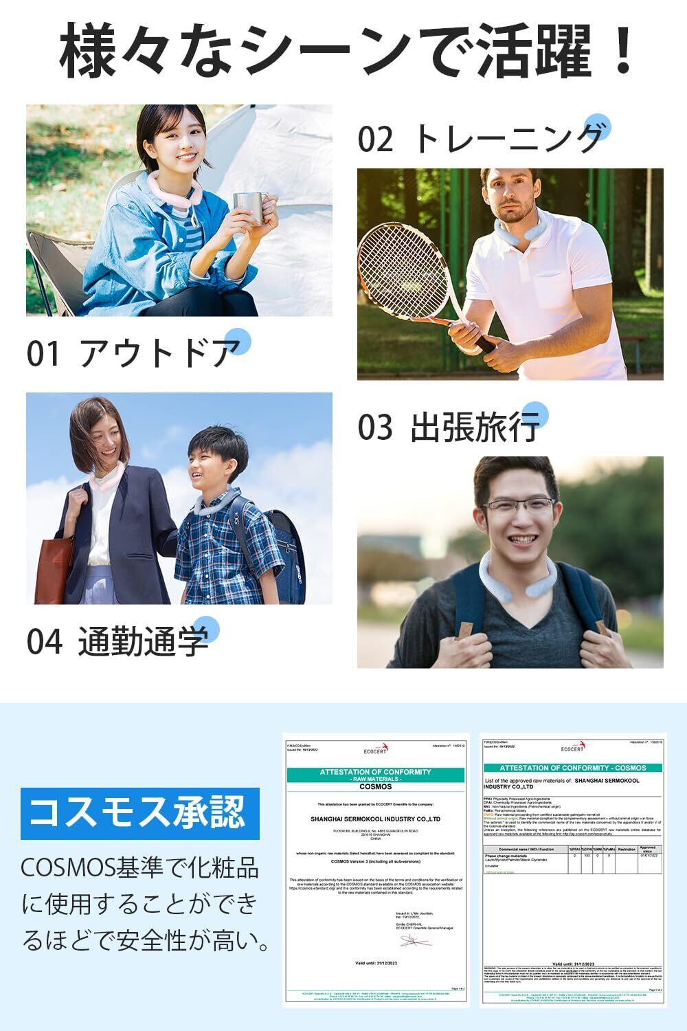 「PCM(相変化材料)を使用しており、温度を21℃に保つことで、体温をしっかりと下げる効果があります。直射日光の下でも安心してお使いいただけ、特にアウトドアや通勤時に重宝します。」