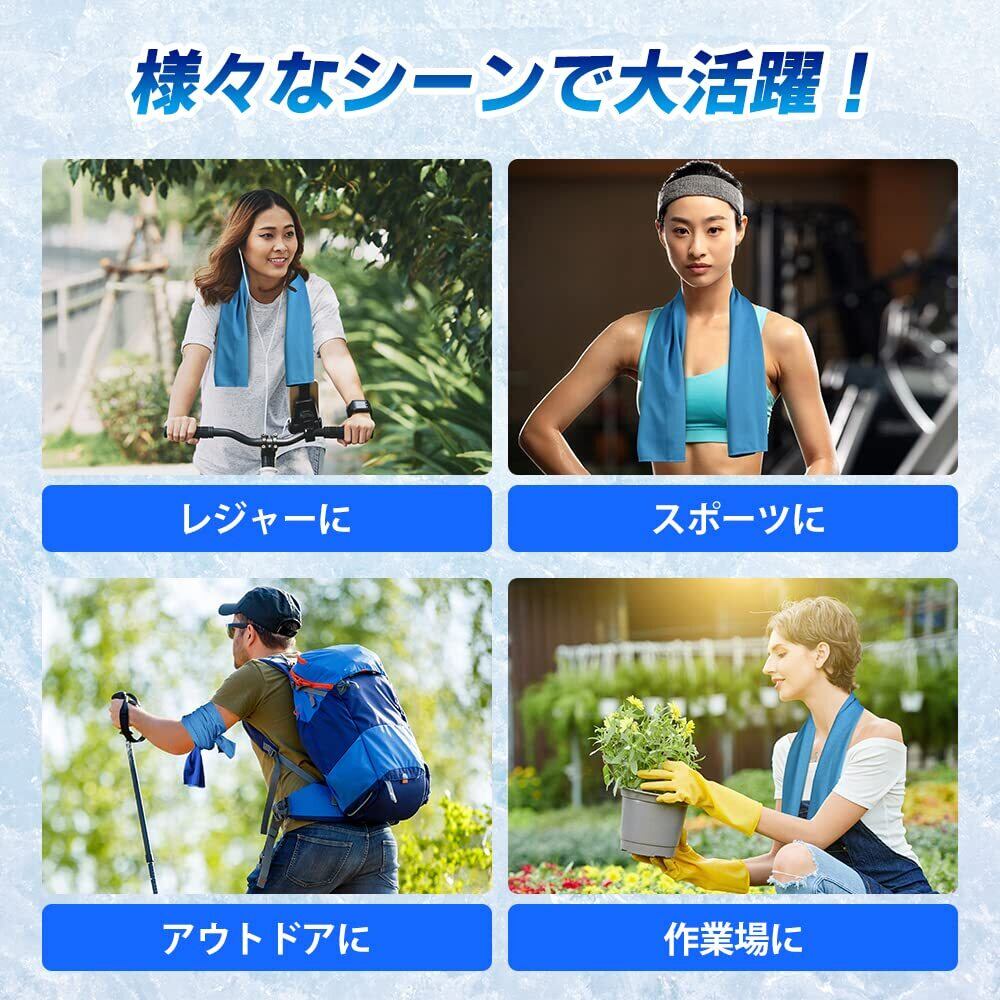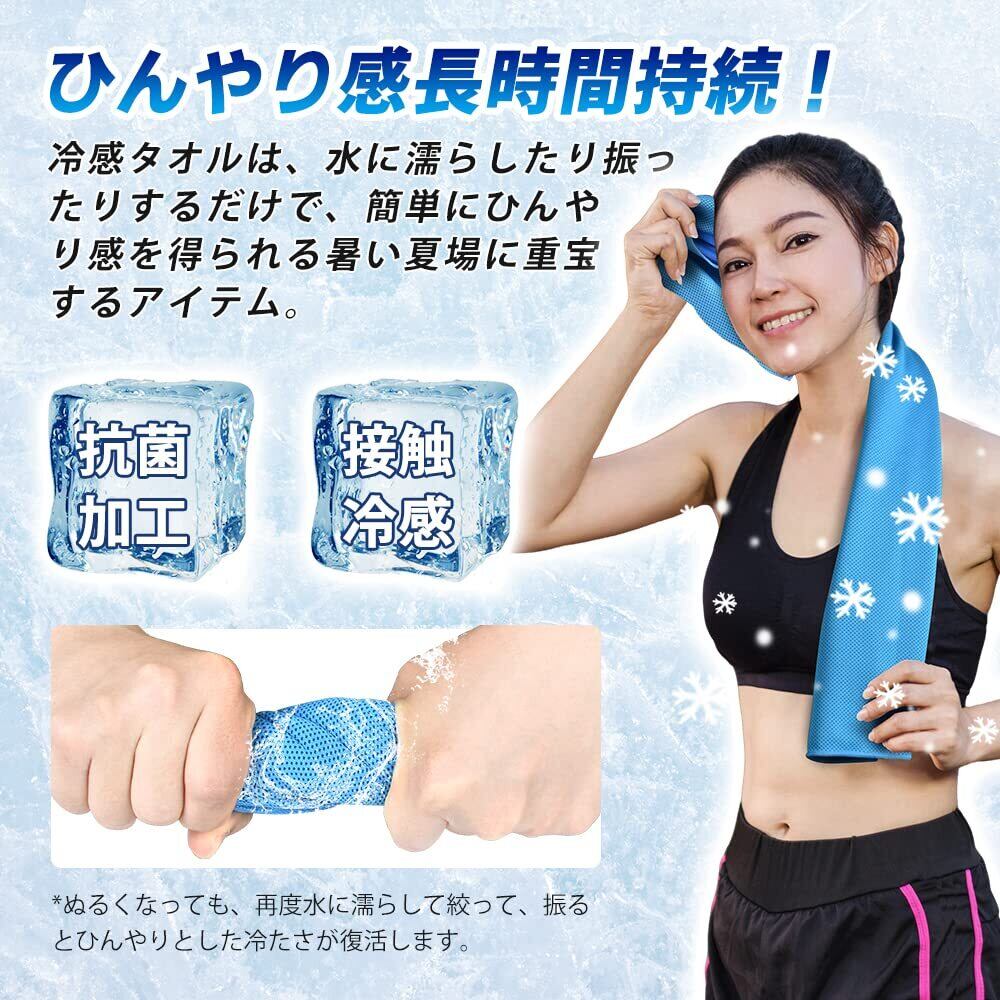 「この冷感タオルは、冷却繊維を使用しており、水で濡らして振るだけで簡単に冷却効果を発揮します。最大で数時間の冷感が持続し、熱中症対策として非常に効果的です!」