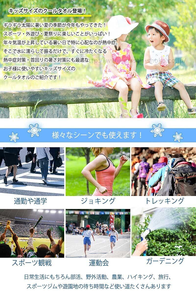 お子様に使いやすいキッズサイズです。 使い方とっても簡単!水さえあれば即、ひんやり!繰り返し使えて経済的! 「吸水」「保水」「蒸発」の役割をコントロールし、効果的に気化熱を発生することで、生地の温度を下げ冷感効果を発生させます。 冷たさがなくなってきたら、振ると 何度も冷たくなります。