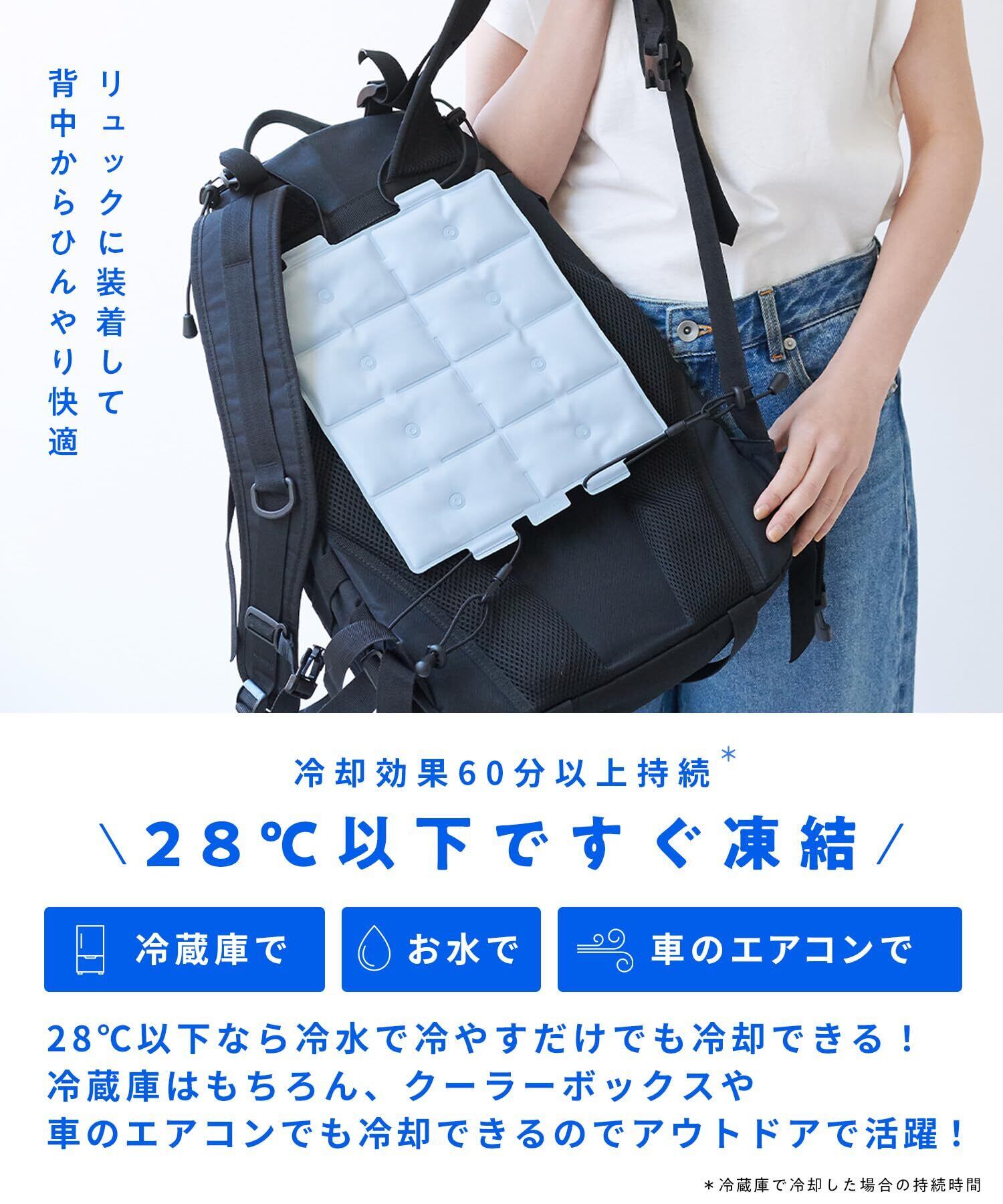 「この冷感パッドは、28℃以下で自然凍結する特別な素材を使用しており、安心して使用できる冷却機能を備えています。リュックに取り付けるだけで、持ち運びも簡単で、アウトドア活動や通勤・通学でも快適さを保ちます。」