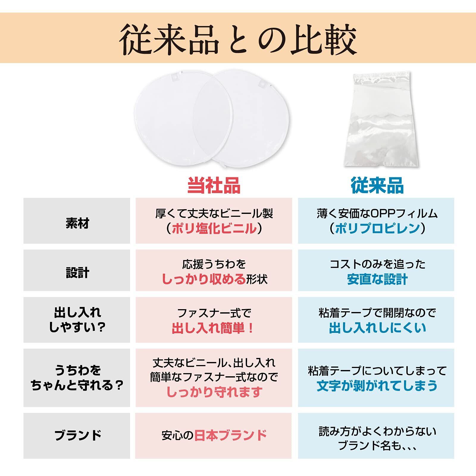 「このうちわカバーは、透明な素材を使用しているため、デザインが映えること間違いなし!うちわを保護しながら、お気に入りのキャラクターやメッセージを邪魔することなく、しっかりと見せることができます。ライブやイベントでの必需品として最適です!」