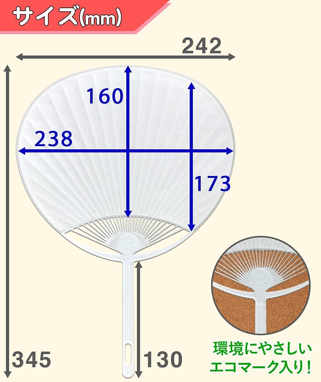 プラスチック製白骨、両面白無地、レギュラーサイズのうちわ10枚セットです! 両面白無地なのでクレヨンやマジック、絵の具等で字や絵がかけます。手作り用、応援用うちわとして便利です。 運動会、お祭り、花火大会、スポーツ観戦時等にどうぞ! 老人ホームや介護施設でも喜ばれています。レクリエーション、ゲームにいかがですか? サイズ:345×242mm 柄の長さ:130mm(詳細は画像をご覧ください) 日本製 (エコマーク表示製品には再生プラスチックを使用するため、どうしても黒の斑点模様の汚れが残る場合があります。ご了承ください。)