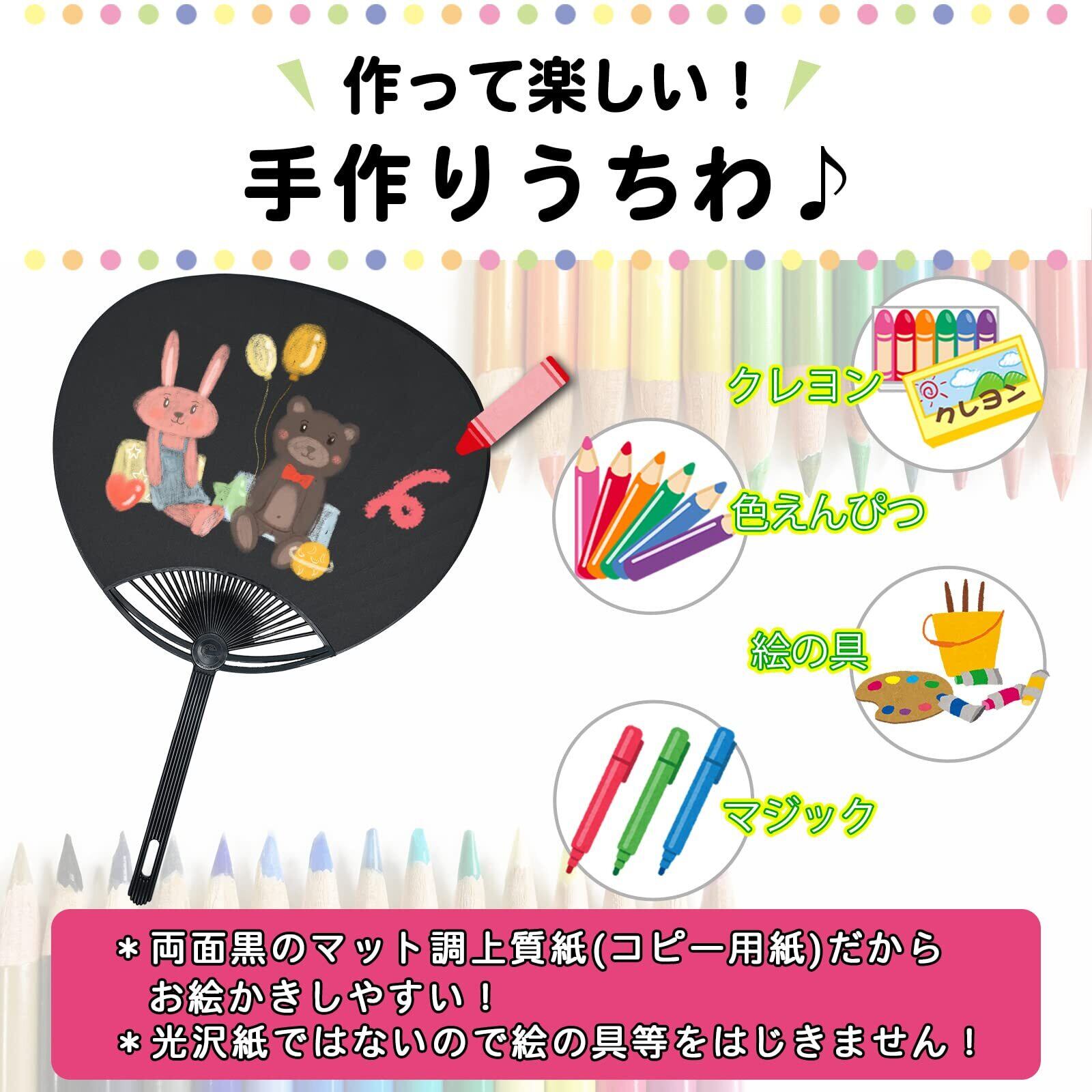 【丈夫で描きやすい素材!】うちわ骨は丈夫な黒のプラスチックのポリプロピレン(PP)製、扇紙は両面マット調の黒無地上質紙(コピー用紙のようなもの)なのでクレヨンやマジック、色鉛筆、マーカー、絵の具等で字や絵がかけます。光沢紙ではないので、絵の具等もはじきません。手作り用、応援用うちわとしてとても便利です!