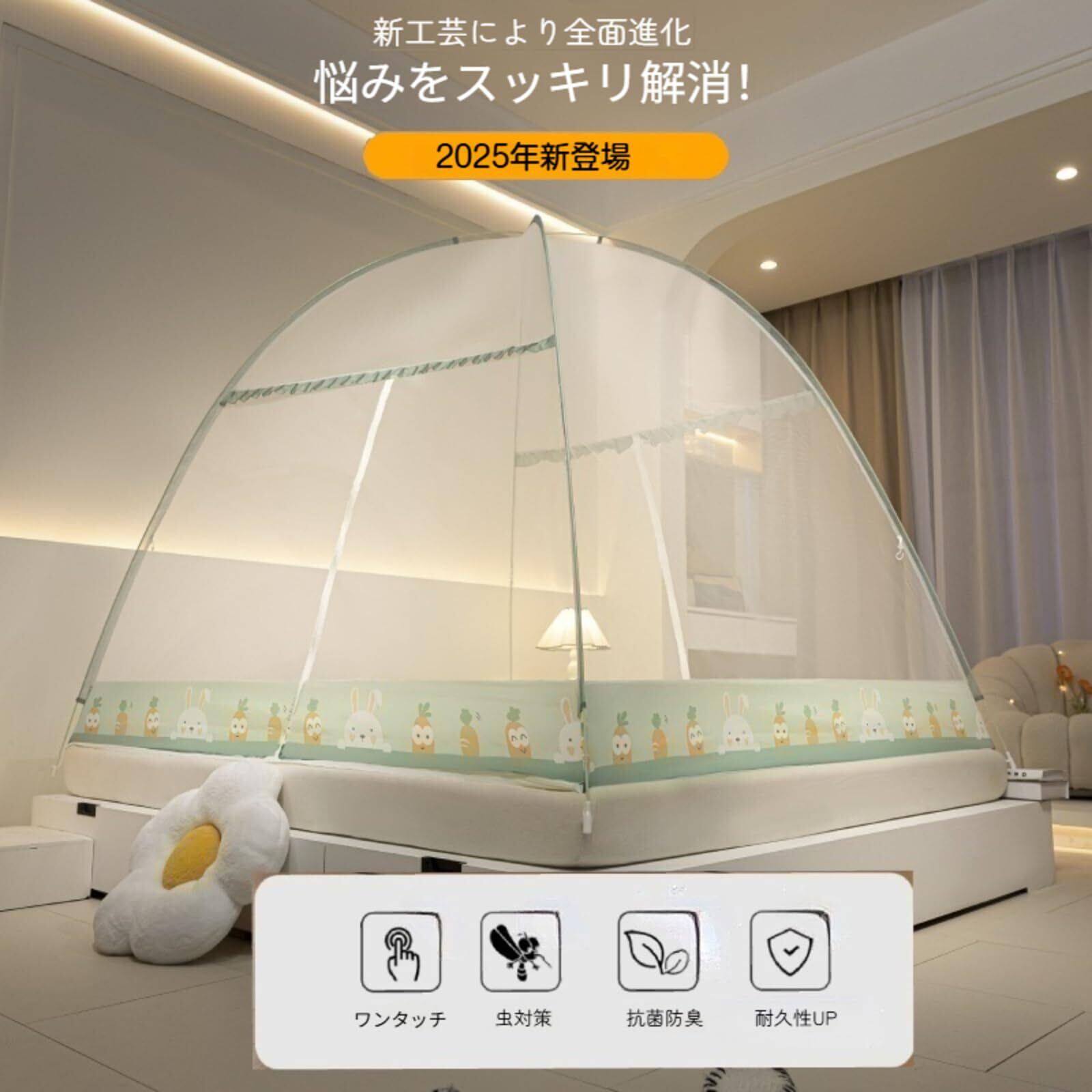 「『蚊帳 テント ワンタッチ』は、改良型の折りたたみ式蚊帳で、簡単に組み立てることができるため、特に夏の暑い夜に快適な睡眠を提供します。このモスキートネット付きのベッドテントは、虫から身を守るだけでなく、通気性も良く、リラックスできる空間を作り出します。」