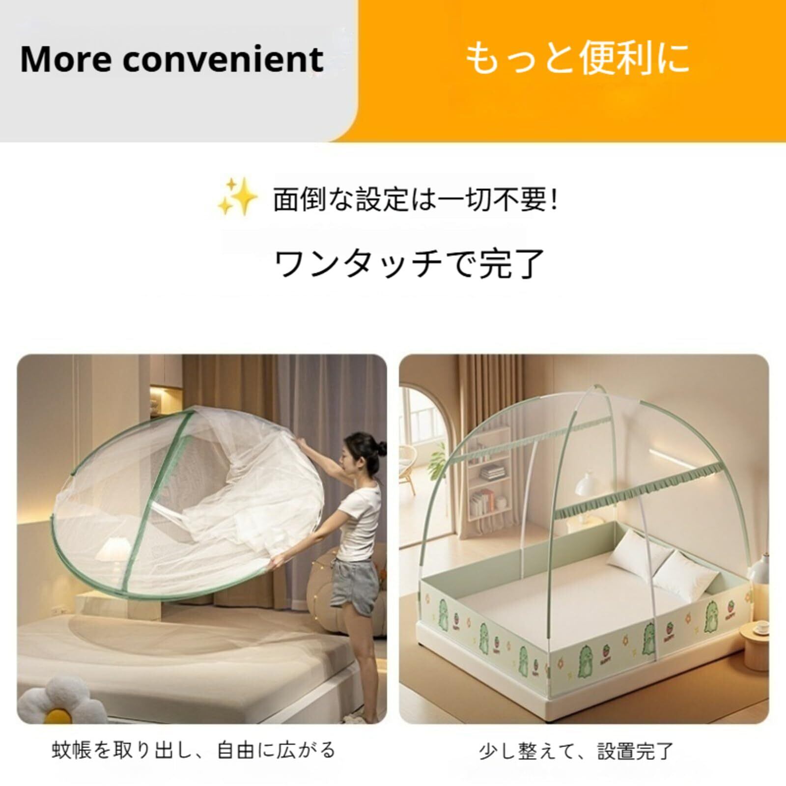 【ワンタッチ・水洗い可能】この蚊帳は、開封後自然に広げて軽く形を整えるだけで、ワンタッチで誰でも10秒以内に簡単に設置することができます。煩わしい組み立て作業が一切不要な一体型設計を採用しており、部品の取り付けや接続の手間がかからないため、初心者の方でもストレスなくご使用いただけます。より合理的な構造のこの蚊帳は従来品に比べて耐久性に優れ、長期間にわたって安定した使用が可能です。また、蚊帳を洗濯する時には水洗いだけで清潔さを保つことができます。水洗い後も蚊帳の型崩れしにくく、すぐに乾くので、衛生面でも安心です。季節を問わず快適にお使いいただける、実用的で便利な蚊帳です。