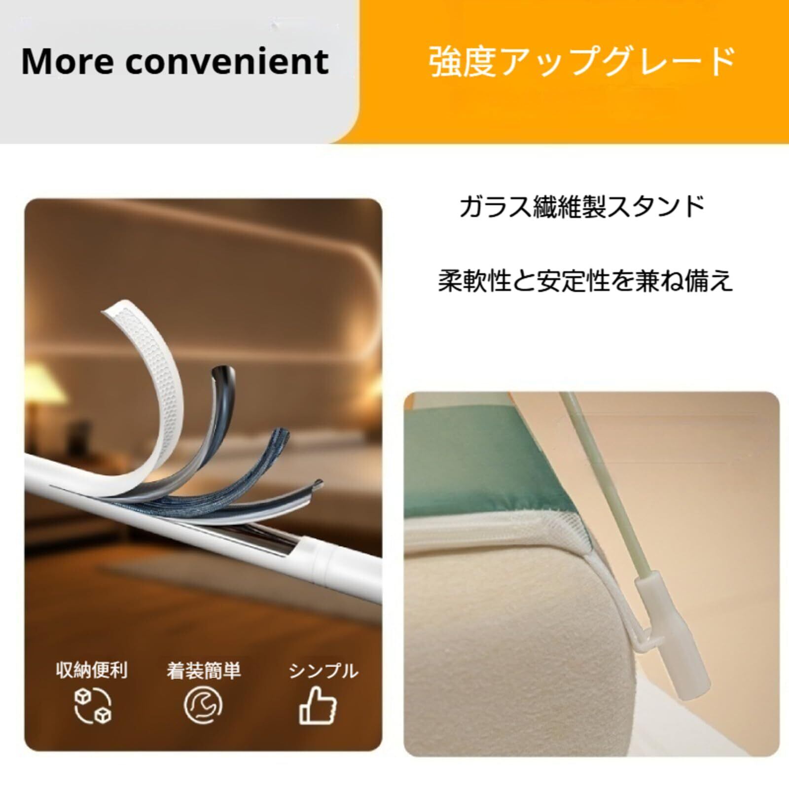 【スペースアップ・ダブルドア】快適性と利便性を徹底的に追求した設計です。上部をワイドに拡大したことで、蚊帳の内部空間が広々と確保されており、寝返りや起き上がりもストレスフリー。両開きのダブルジッパーを採用したこの蚊帳なので、どちら側からでもスムーズに出入りできます。さらに、蚊帳の天井部分には調節可能な固定バンドを装備。小型扇風機や照明などの小物を吊り下げられるので、夏の暑い夜も涼しく過ごせます。